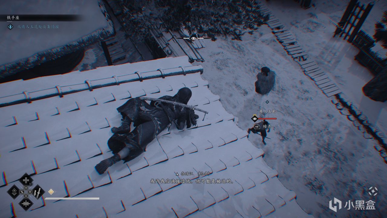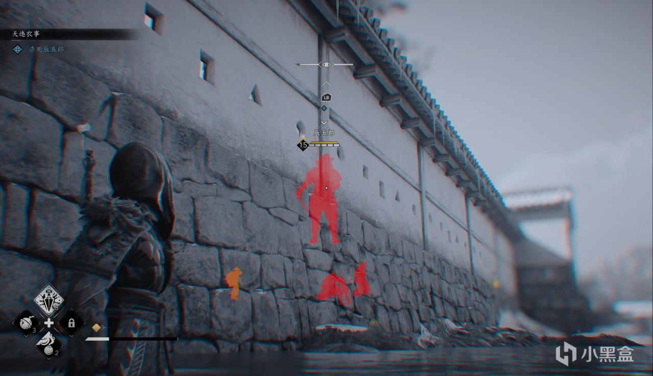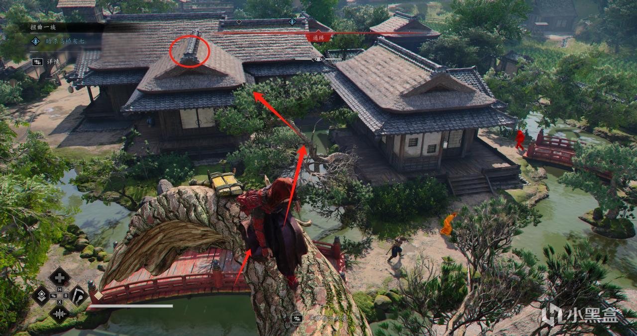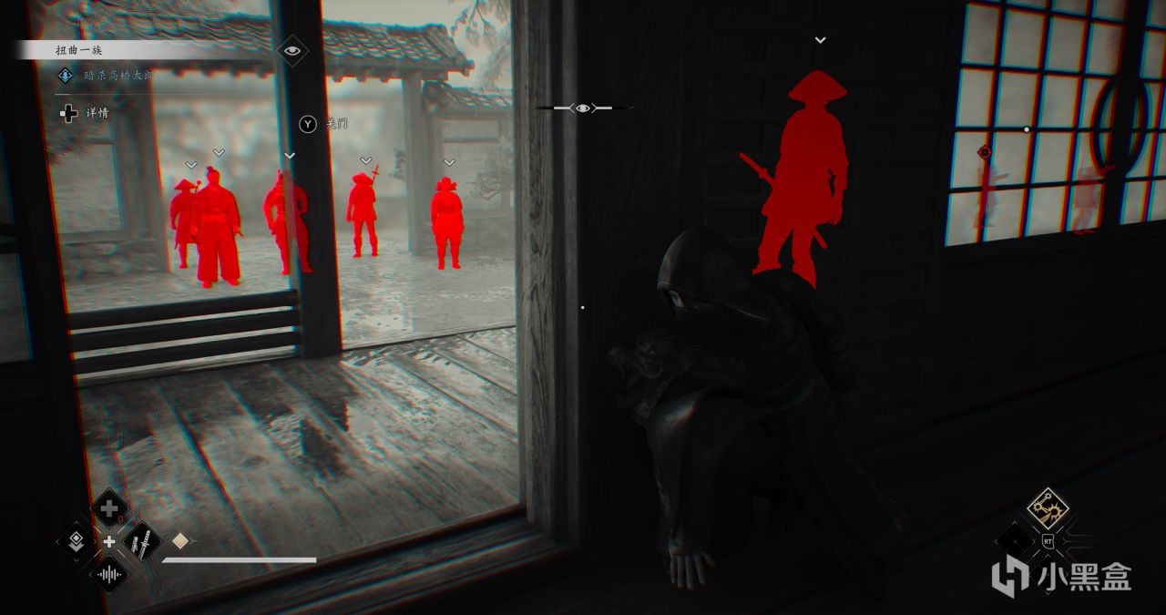 這裏有兩種方案,一種是去殺亥七,其他兄弟之後都會來父親這邊集合,我們一口氣全部解決,或者是四處收集字條線索,逐一擊破,慢慢看這一家人的故事。用探子找到父親高橋亥七的位置,然後從外院的樹上跳進池塘,一路潛行進房屋,用鷹眼可以看到一個坐在房屋中間的人。
