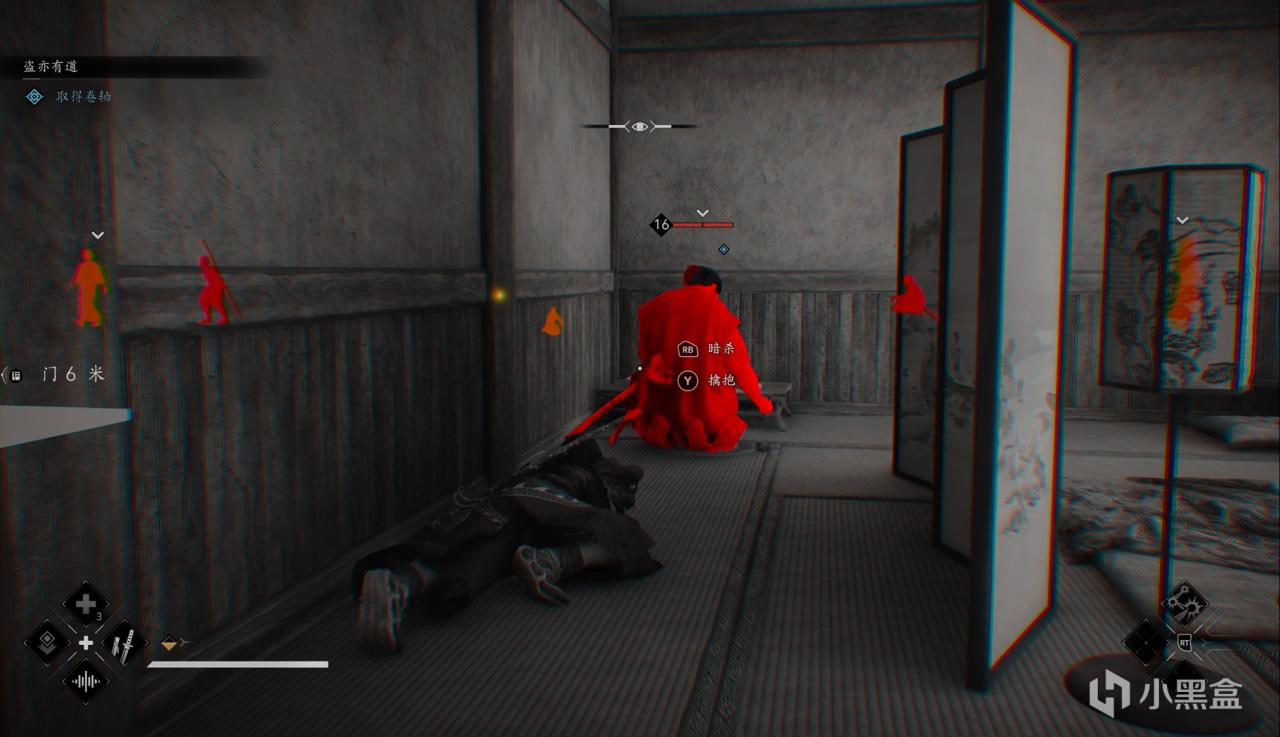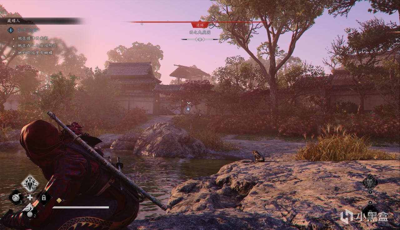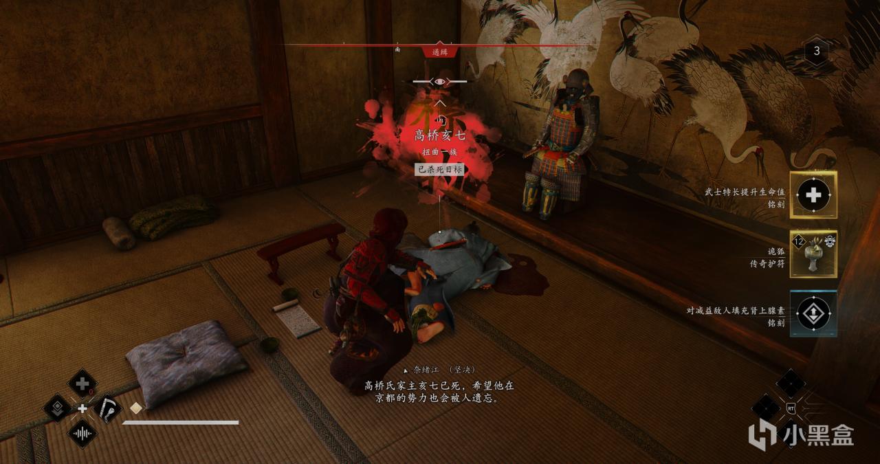 這裏有兩種方案,一種是去殺亥七,其他兄弟之後都會來父親這邊集合,我們一口氣全部解決,或者是四處收集字條線索,逐一擊破,慢慢看這一家人的故事。用探子找到父親高橋亥七的位置,然後從外院的樹上跳進池塘,一路潛行進房屋,用鷹眼可以看到一個坐在房屋中間的人。