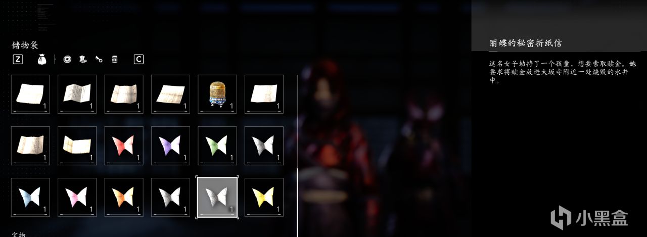 殺完三個夫人後,藏蝶人頭目又揭開了兩個新任務,一個是去找商人對話,商人位置在大阪寺正北方向。最後一個任務蝶蛹在漁民區西北方向,如果沒有探子,可以直接去大致方位,然後R2開視野,又是一個小紙條,告訴我們大BOSS是花蝶,最後一個任務暗殺花蝶也可以追蹤了。