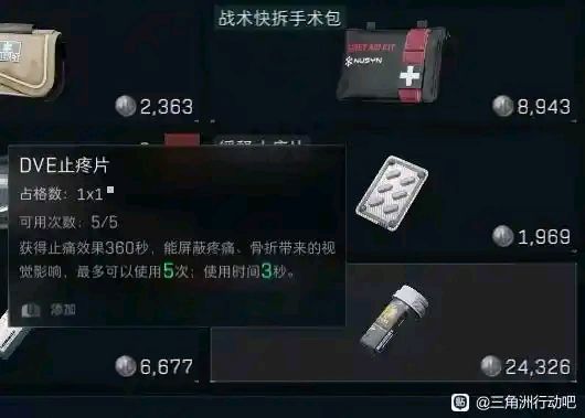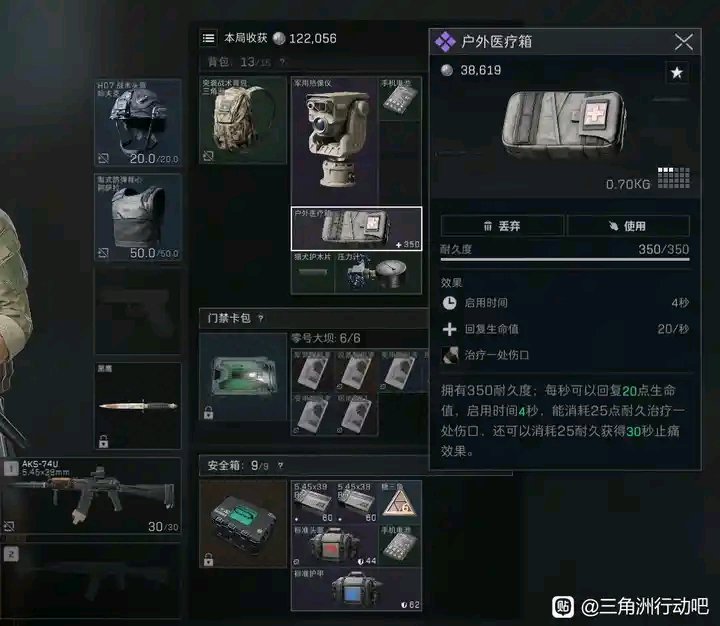 治療藥物如果沒有特殊說明例如消耗耐久止痛藥話那麼一點耐久就對應一點血量,而戶外醫療包在有止痛效果但情況下還會消耗耐久增加止痛效果。這就導致了這款血包在單純回血方面非常不實用甚至還不如藍色的急救包和綠色的注射劑。這款血目前在交易行售價接近4萬哈夫幣性價比很低,平時在軍需處3萬左右兌換一個帶在身上可以在激烈戰鬥中快速回血性價比還可以,但如果要拿這款血包單純回血用的話那他還不如用藍色的醫療包和綠色的注射器。