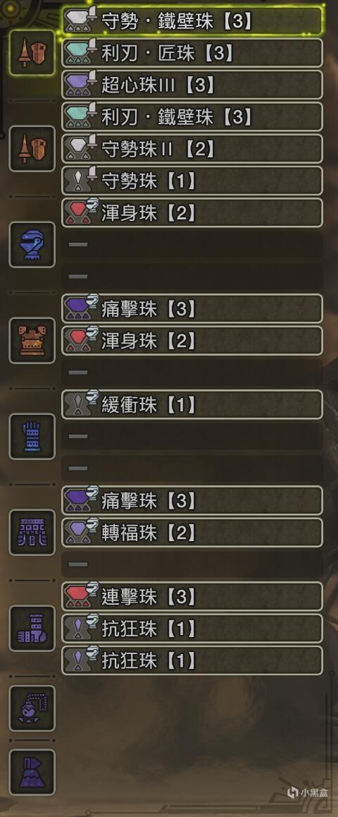 輸出技能守勢和超心,會心技能弱點特效、精神抖擻和無我境界。挑戰者、連擊和鎖刃刺擊屬於是錦上添花。無傷和怨恨的覆蓋率比較低,不過你蓄反用的多就可以出無傷,蹲防用的多就可以出怨恨。防性和防強不太需要,因爲有蓄反不會掉血也不喫防性防強。防性一般出1級或者不出。防強不打白熾龍那種怪完全不需要出。