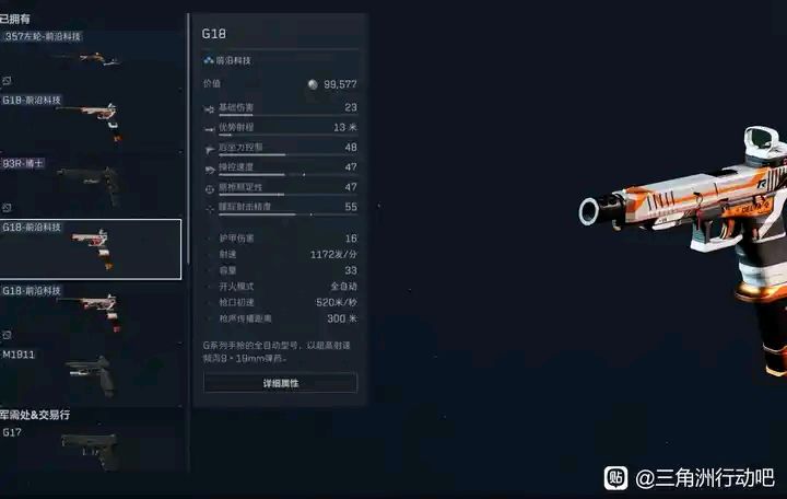 偷人奪舍和狙仔防身的優秀武器,全自動高達1172每分鐘的射速火力十分兇殘。配合高級穿甲彈(不推薦太浪費錢了)或者三級rip彈可以在近距離瞬秒任何人。鼠鼠可以用來打人奪舍直接飛昇吳濤甚至六套大哥,狙仔可以在被敵人拉近點時從褲襠裏掏出g18給人反手打死,配件除了33發彈匣外都可以不裝,畢竟優勢射程實在是太低了什麼配件都影響不大隻要無腦掃腿或者穿甲彈打胸口就行,純跑刀鼠鼠清理人機就不要用這把槍了因爲單發傷害太低了很浪費子彈而且容易暴露。