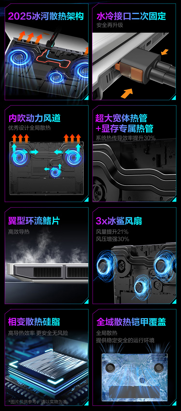 採用全新2025冰河散熱架構,3風扇+內吹結構,搭配納米相變散熱硅脂,散熱效率高。