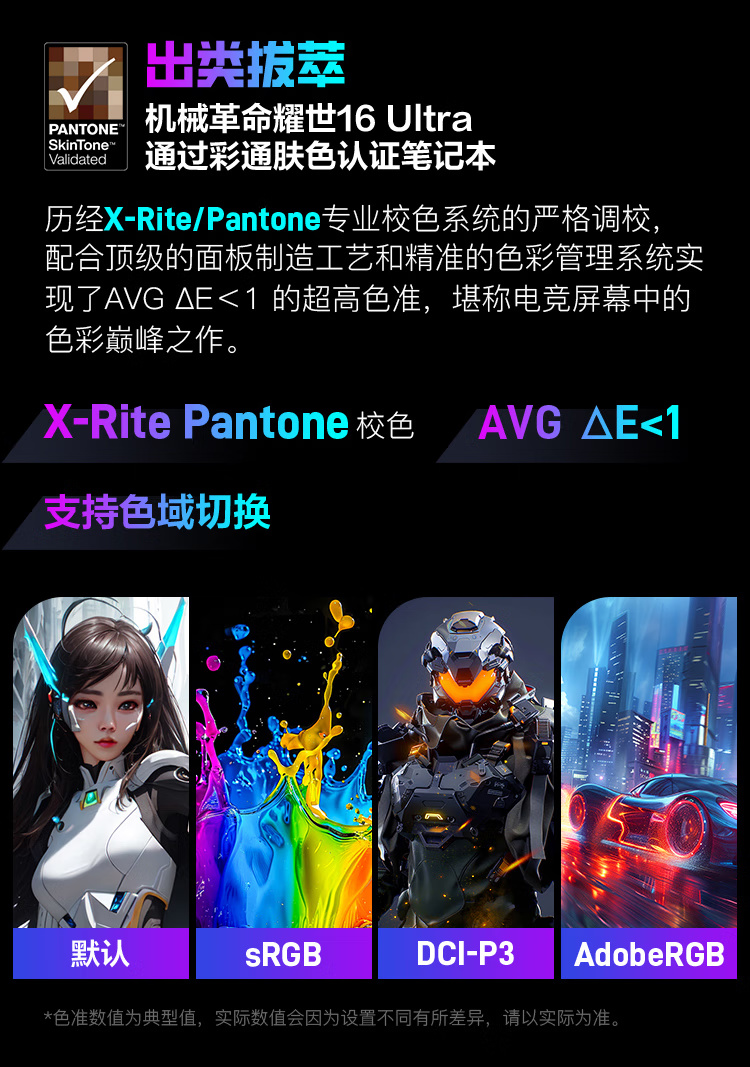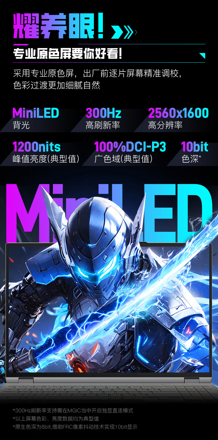 高配和頂配版採用2.5K分辨率、100%DCI - P3廣色域、1200nit峯值亮度、300Hz刷新率的miniLED面板,經專業調校,平均ΔE<1,顯示效果出色,色彩準確。