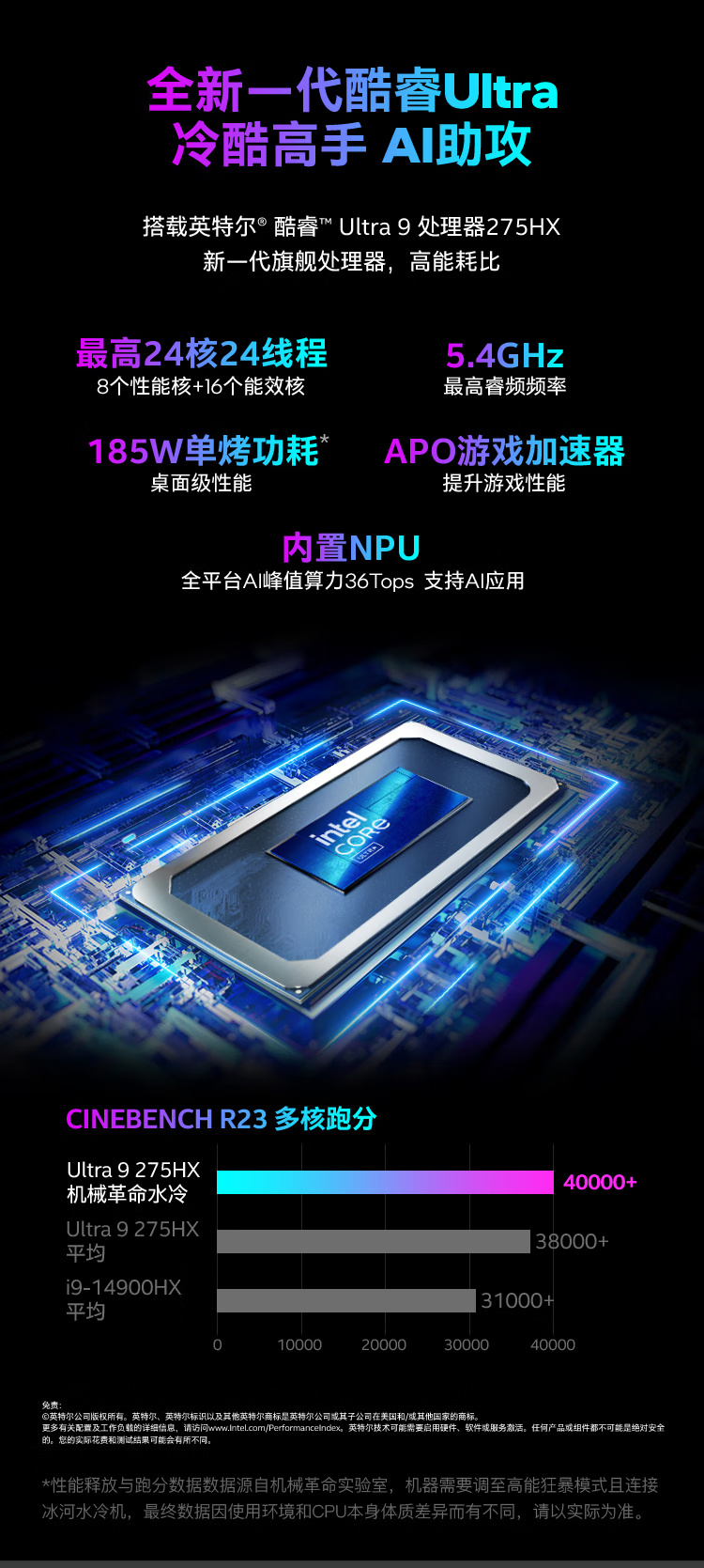 全系標配英特爾酷睿Ultra 9 275HX處理器,8大16小24核心24線程,最高睿頻5.4GHz,性能強勁且能效比高,相比14900HX有比較明顯的性能提升。
