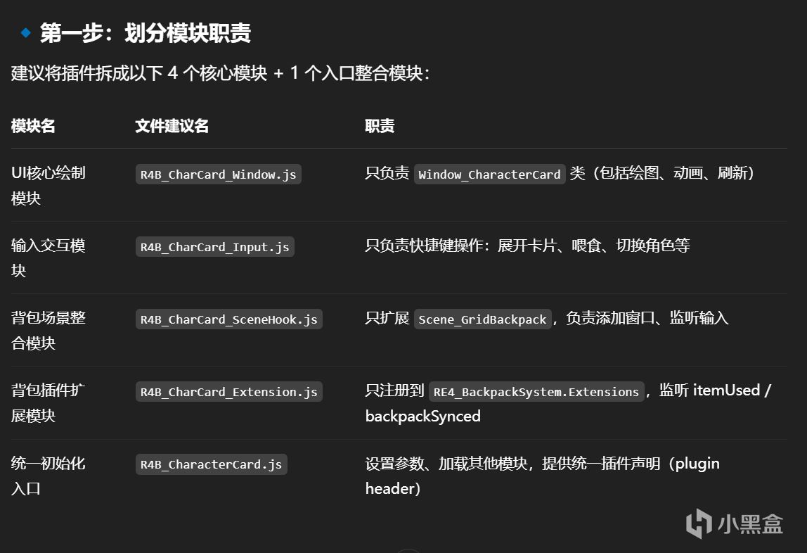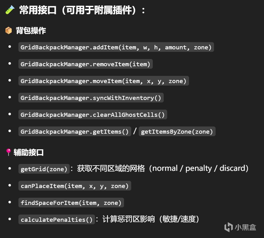 因此需要採取說明文檔的手段,儘量減少不必要的代碼信息,在這裏我主要用了ChatGPT來整理插件內容,將它們裏面功能的主要調用方式以及功能都列舉出來,這樣只要不涉及到和揹包核心代碼直接相干的地方,都可以讓AI直接引用對應的部分,比如揹包的場景名,以及揹包的功能API,都可以在說明文檔裏快速獲取,這樣就可以讓一個4000行的大型代碼文件被縮短精簡成一個只有四五十行的插件說明文檔,可以大大提高AI對話的利用率,這在編寫和原插件相關而不涉及核心代碼的其他功能插件來說,是一個比較實用的方法。