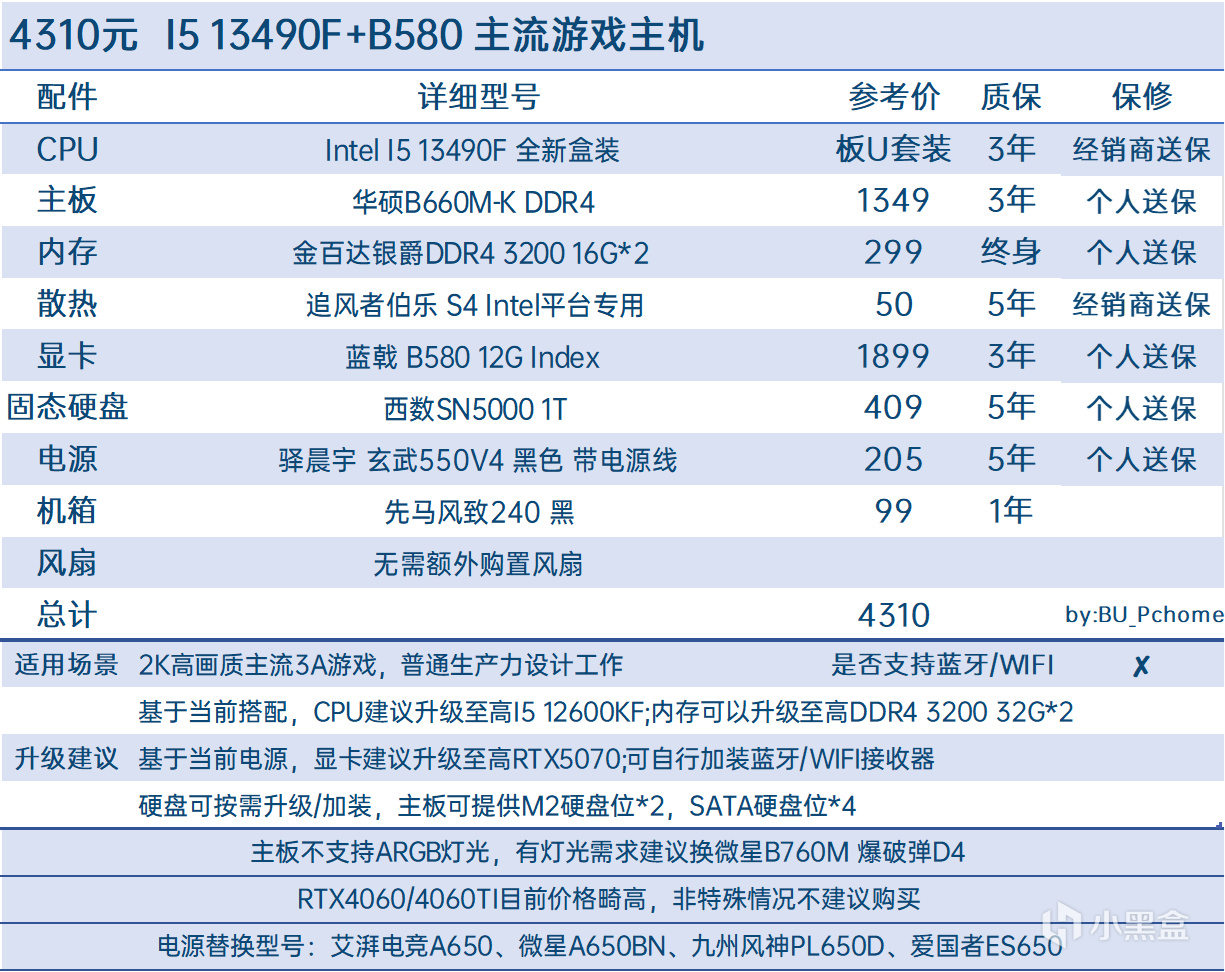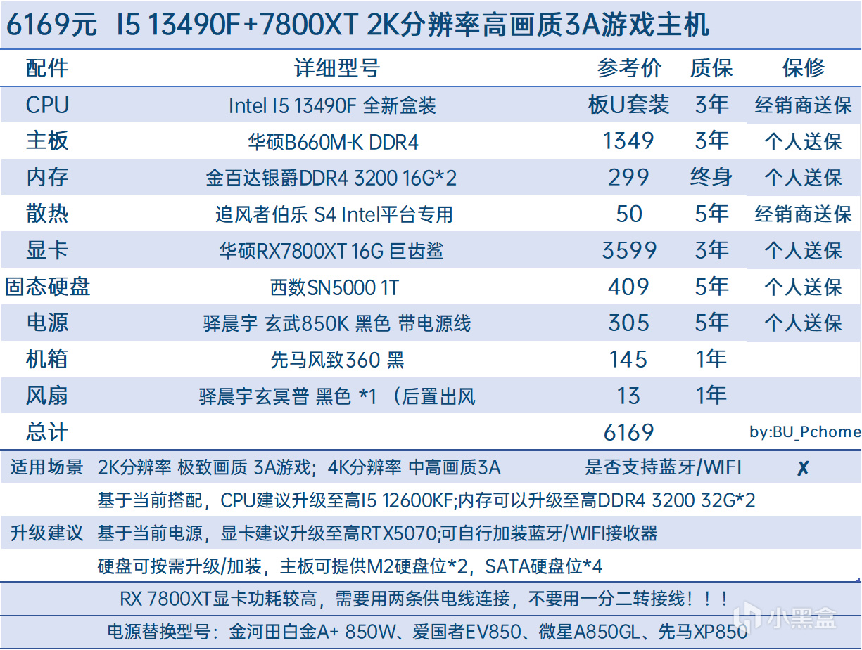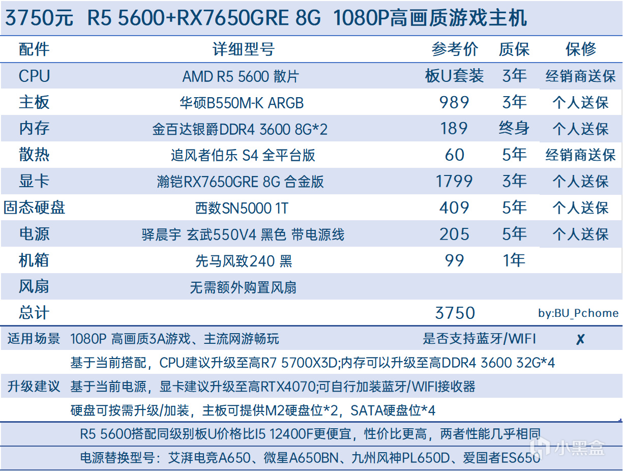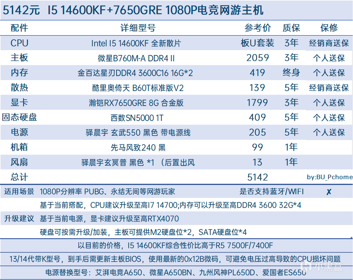 關於電源:如果覺得我給的電源檔次偏低,自己可以加錢換其他型號,更換顯卡時請務必關注電源是否夠用/機箱兼容性;