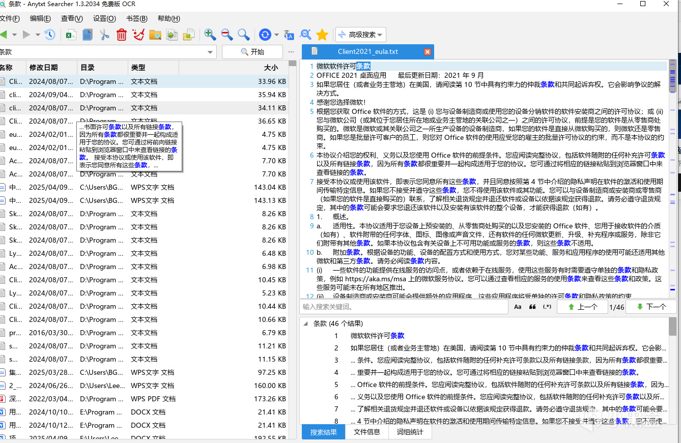 此外,AnyTXT Searcher 還提供了便捷的預覽功能,不僅能在找到相關文件後自動高亮顯示關鍵詞,還在界面右側提供文件內容的預覽視圖。