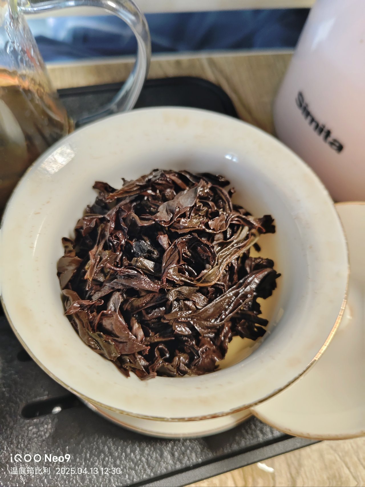 第二步:搖香。打開泡袋,能聞到熟果香與桂皮香氣。將茶葉倒入蓋碗內,合蓋左右搖晃,開蓋可聞到屬於肉桂茶霸氣辛辣的肉桂香氣。