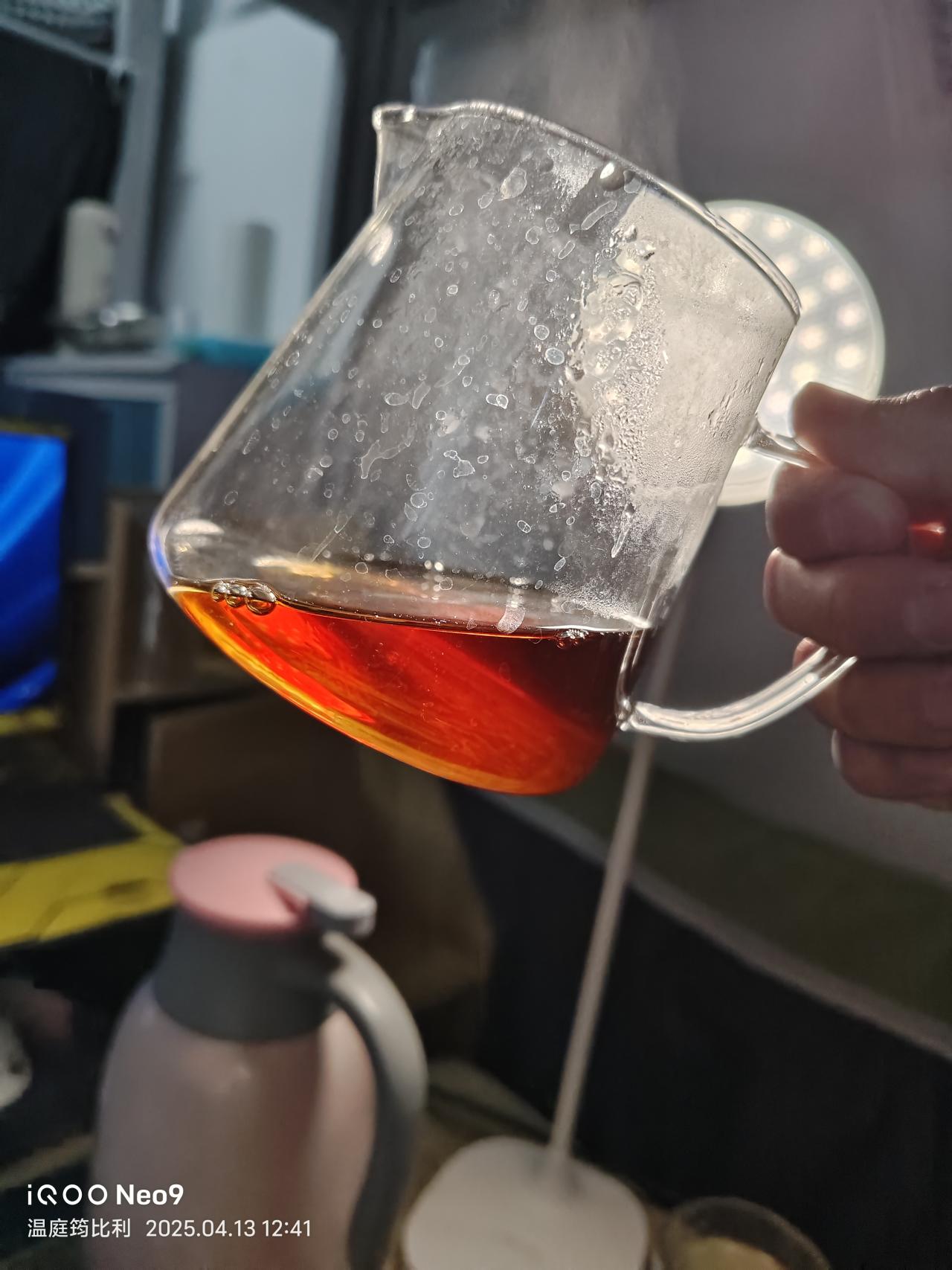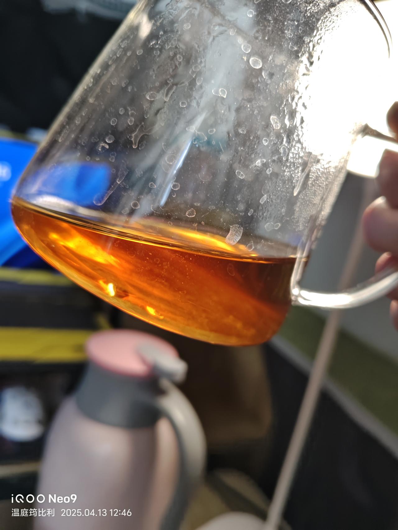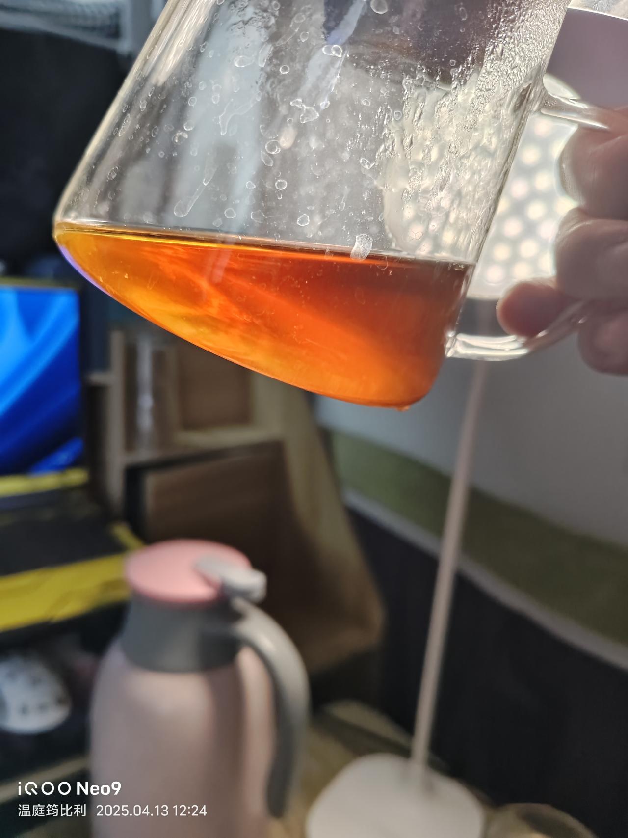 第5泡,100度沸水注入,坐杯2分鐘(因爲刷抖音給忘了,本來一分鐘左右就夠了)。茶水呈橙紅琥珀色。由於坐杯時間長,茶中內含物質充分析出。茶湯沒有明顯變厚,入口桂味明顯且包裹舌頭,化開後迅速回甘,舌根能感到明顯的甜與木質香,但喉嚨反出的肉桂氣息沒有第一泡濃郁。