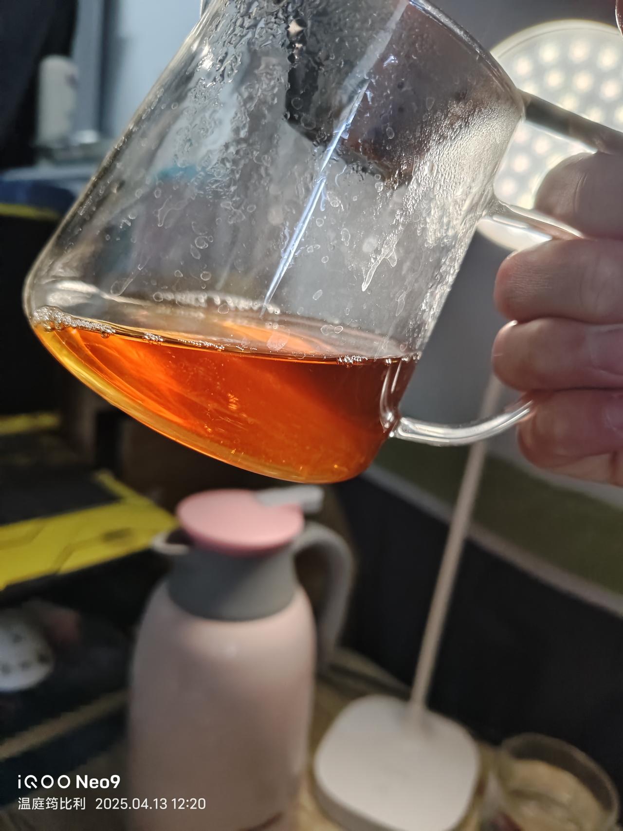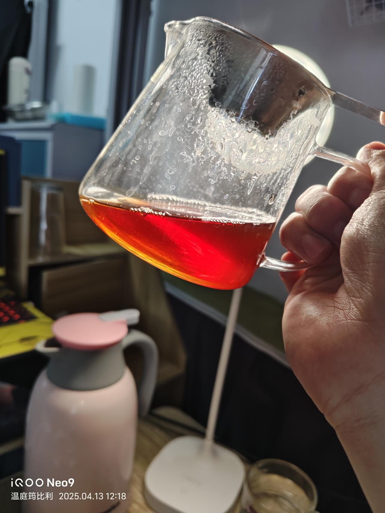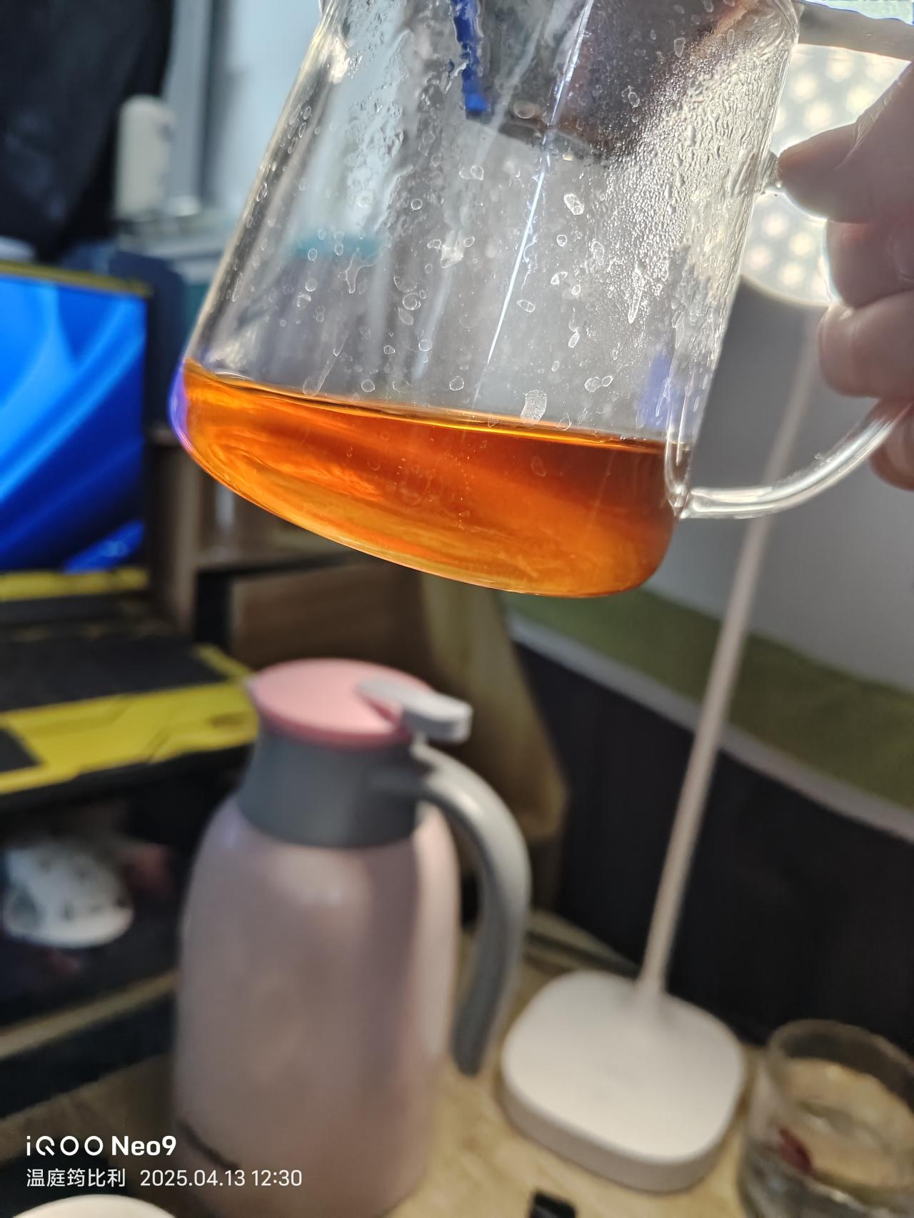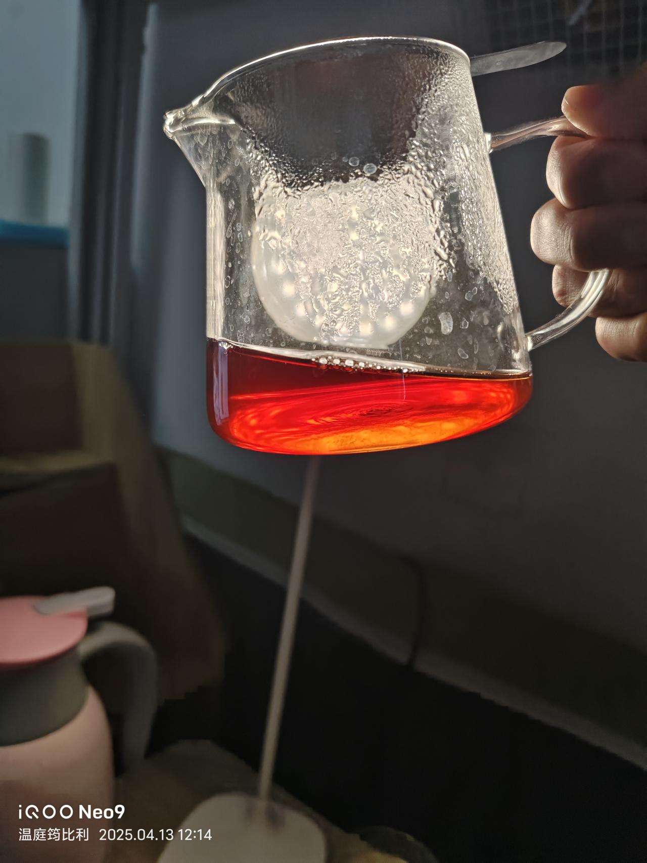 第5泡,100度沸水注入,坐杯2分鐘(因爲刷抖音給忘了,本來一分鐘左右就夠了)。茶水呈橙紅琥珀色。由於坐杯時間長,茶中內含物質充分析出。茶湯沒有明顯變厚,入口桂味明顯且包裹舌頭,化開後迅速回甘,舌根能感到明顯的甜與木質香,但喉嚨反出的肉桂氣息沒有第一泡濃郁。