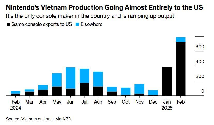 彭博社最新報道稱,在美國對世界其他地區的進口產品加徵關稅的背景下,任天堂最近已將超過一百萬臺在越南製造的Switch 2遊戲機運往美國。自從唐納德·特朗普再次當選美國總統以來,全球市場一直在走向美中貿易戰的影響之中,任天堂似乎試圖通過儘快將其Switch 2遊戲機運往美國來避免最壞的影響。