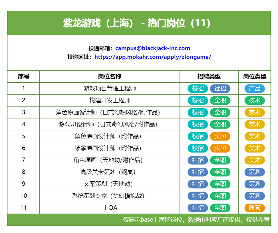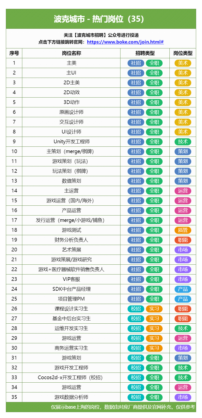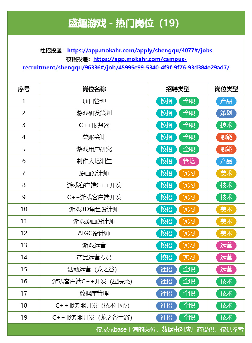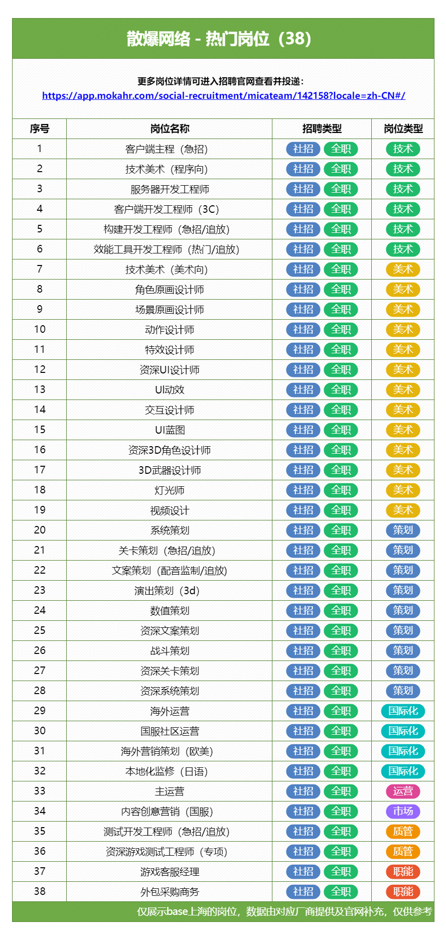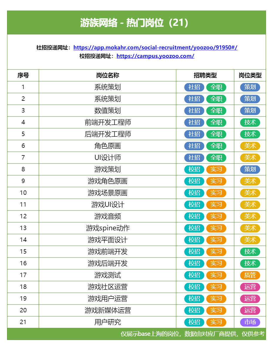 本文另附上海遊戲公司春招熱門崗位在線文檔,歡迎各位查看和交流: