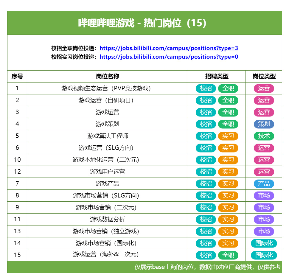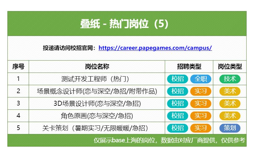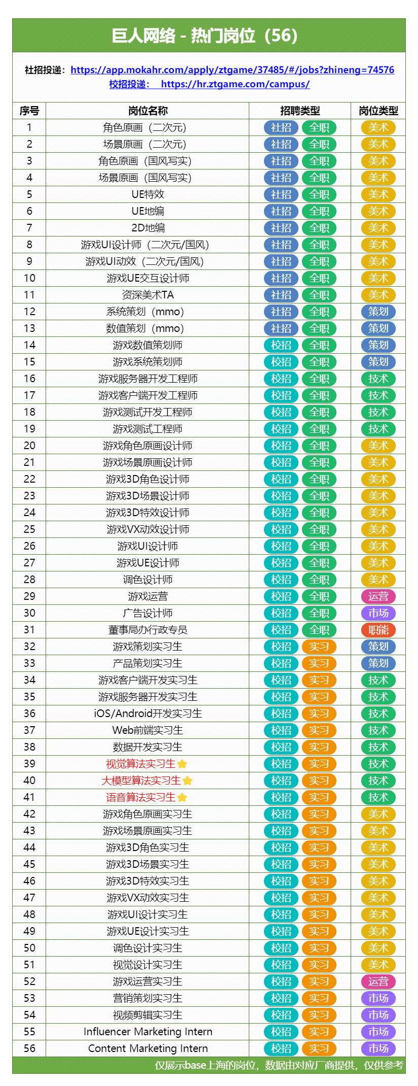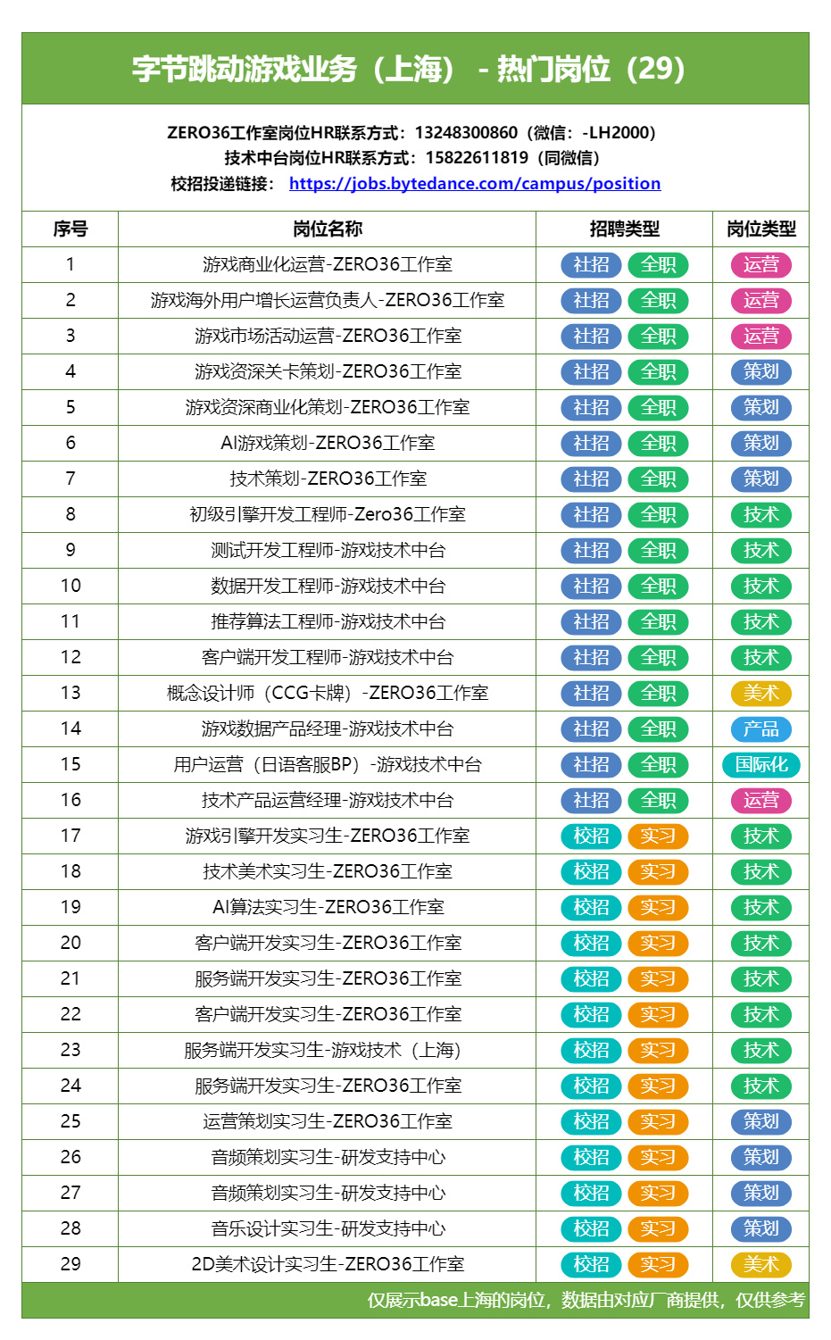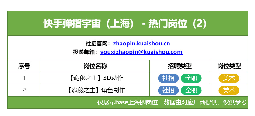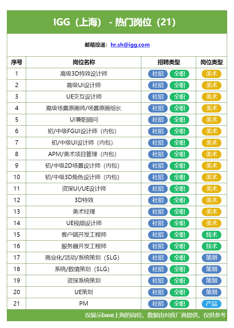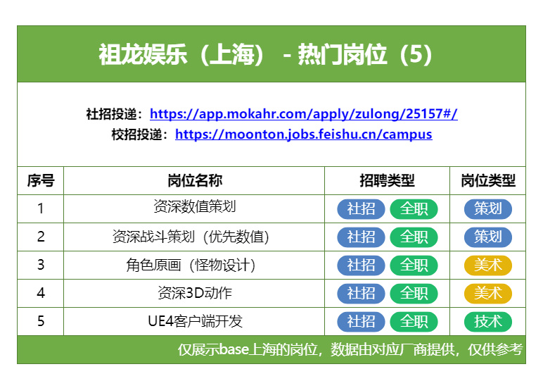 本文另附上海遊戲公司春招熱門崗位在線文檔,歡迎各位查看和交流: