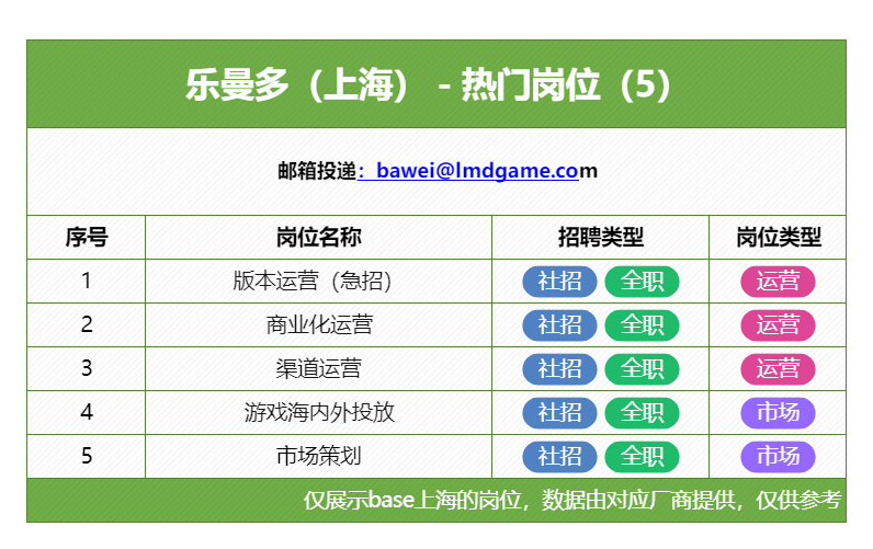 春招信息及崗位明細表(三方整理,共5個崗位),投遞郵箱:bawei@lmdgame.com 。