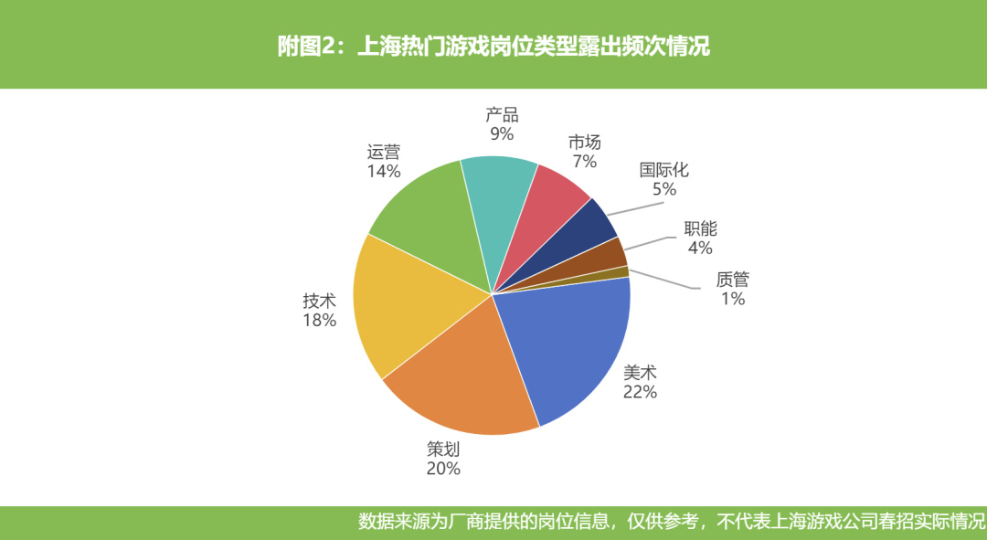 從招聘類型來看,上海遊戲公司提供的社招崗位佔比爲57%,超過春招校招崗位。這可能跟企業用人需求更即時和常態,而春招通常作爲秋招的補充,崗位較少有關。