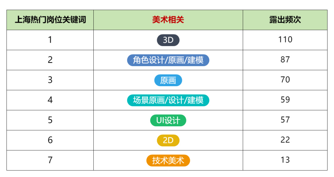 從崗位類型來看,美術是統計招聘中最熱門的崗位類型,其中3D、角色設計、場景原畫、UI設計等人才的需求量最大;