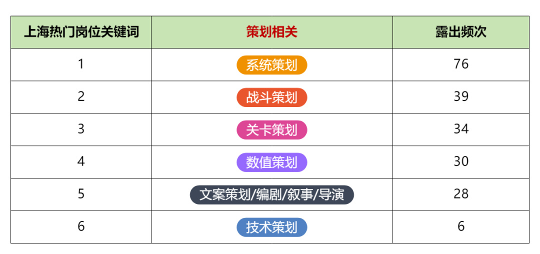 策劃崗位中,系統策劃需求最突出,戰鬥、關卡、數值等崗位次之,文案策劃崗與主流崗位數量接近。這一分佈既體現了敘事內容類人才的稀缺,以及上海遊戲公司對這類人才的認可和重視。