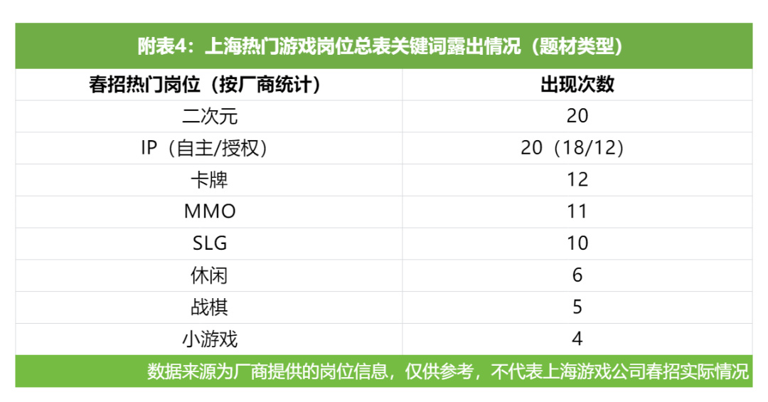 品類方面,上海遊戲圈仍以二次元爲主,接近一半的統計廠商有重點二遊項目及對應儲備,想在上海做二遊的求職者仍有很多機會。