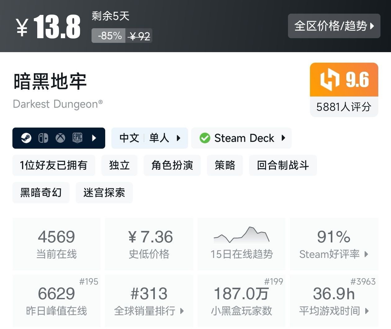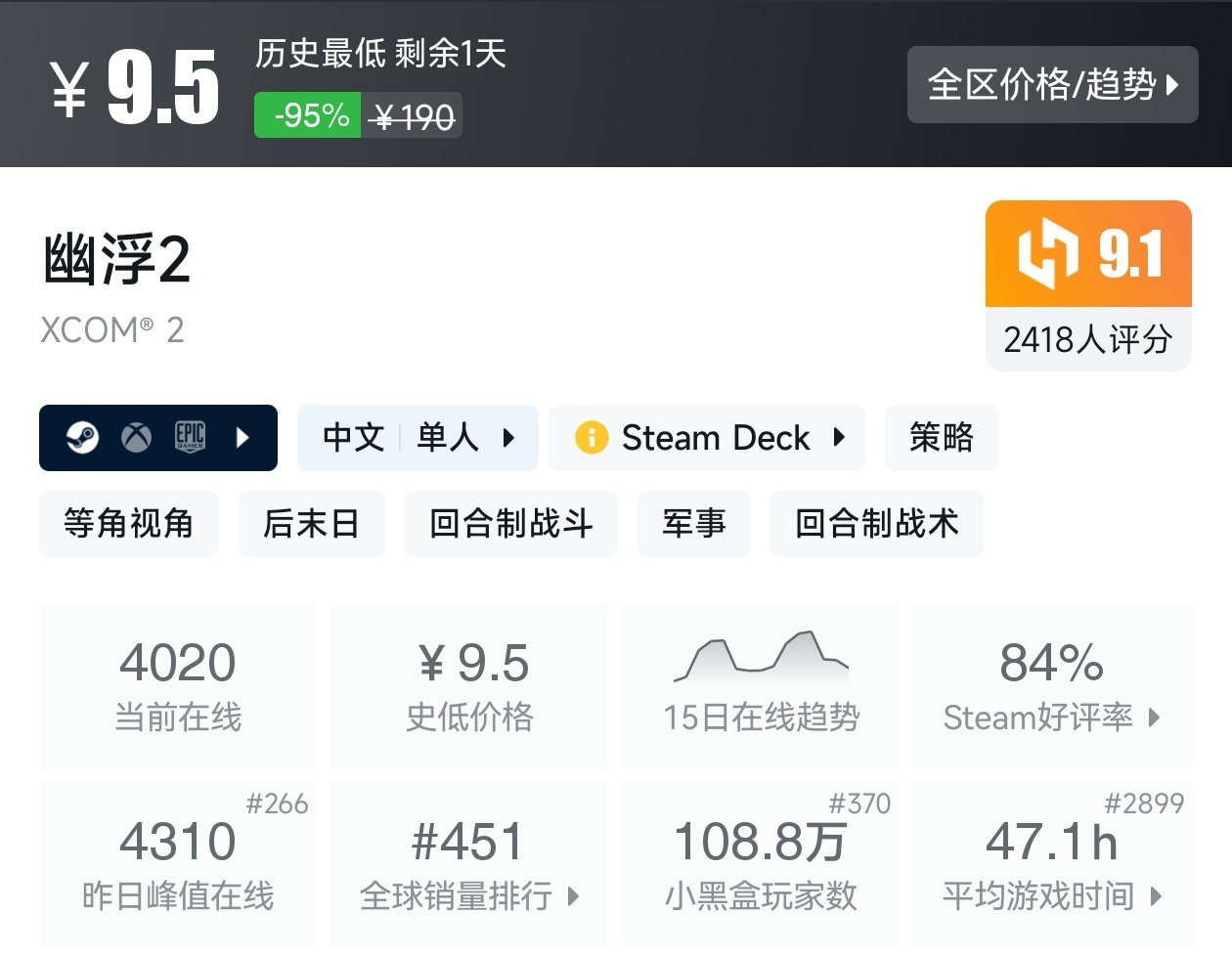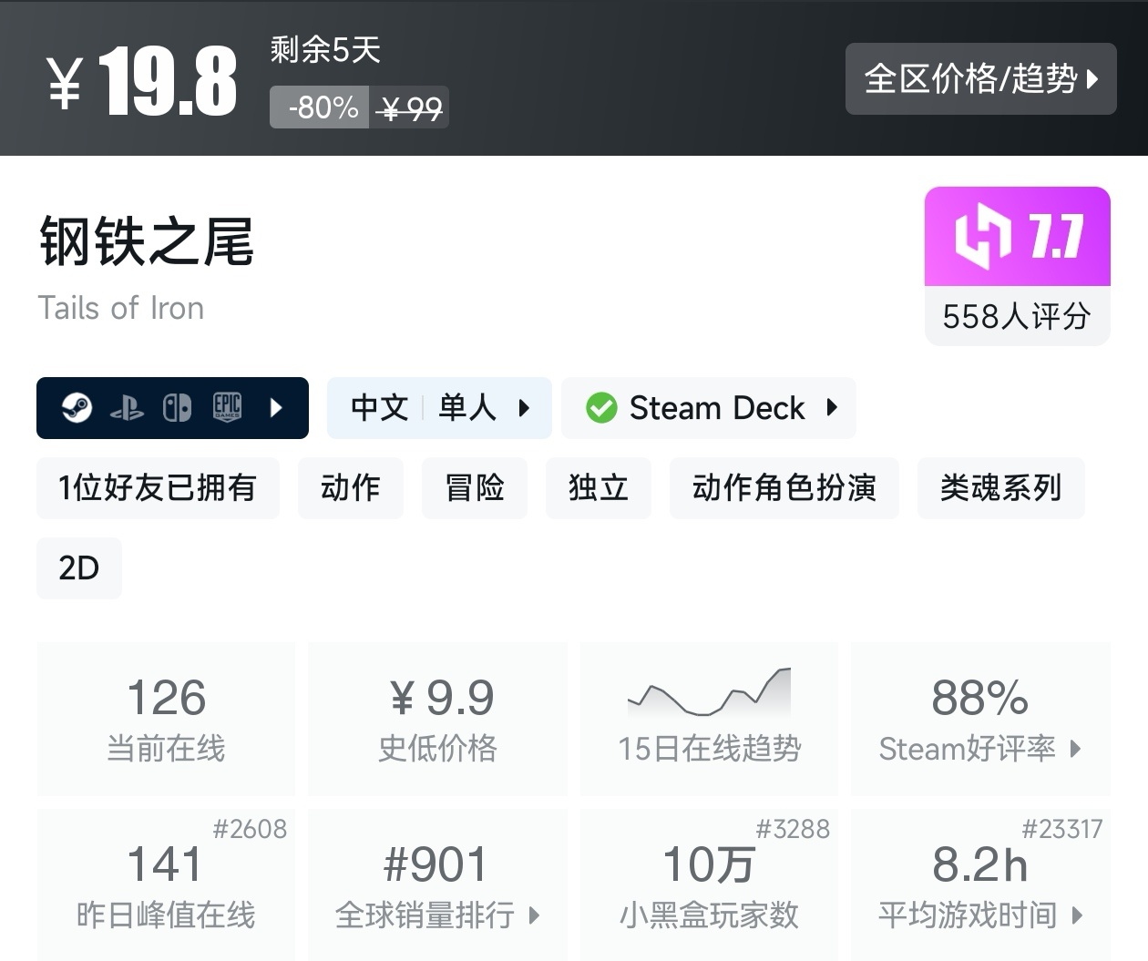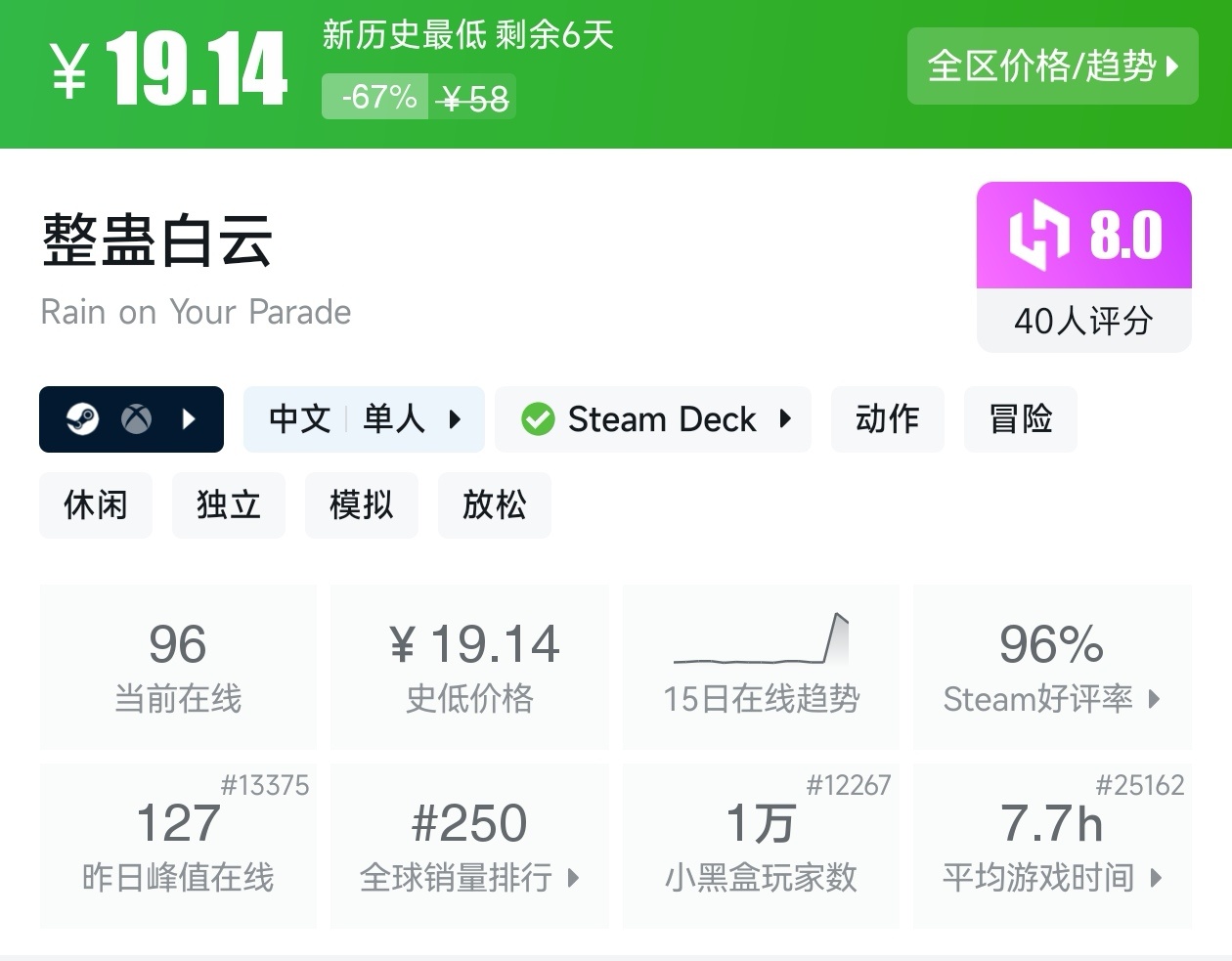 大家好,沒錯,又是我,你們的老朋友亦然,最近有很多遊戲都迎來了折扣,當然,包括很多史低遊戲,在我統計的時候就發現有很多20元以下的遊戲,不僅擁有很高的評價,而且還是史低,接下來我將爲各位進行一個彙總,希望我的彙總,能夠幫助各位盒友挑選心儀的遊戲。