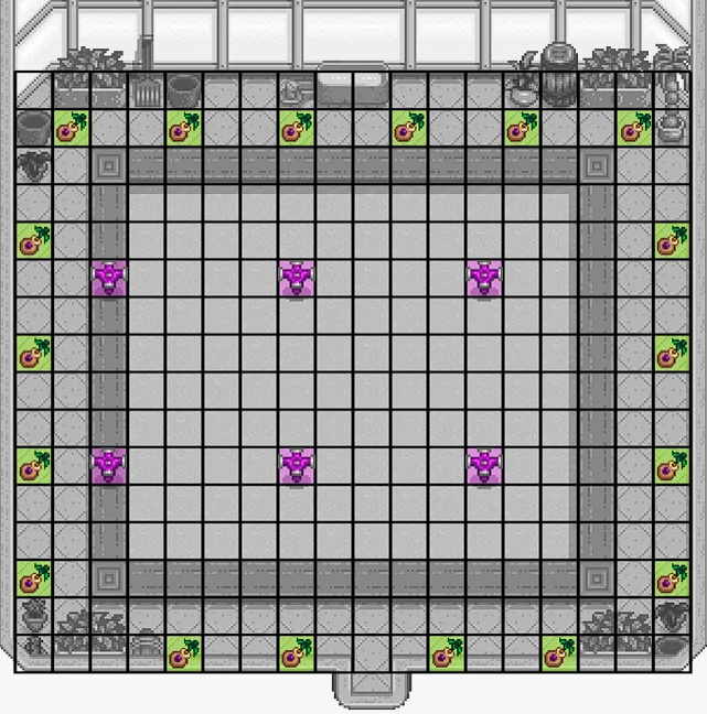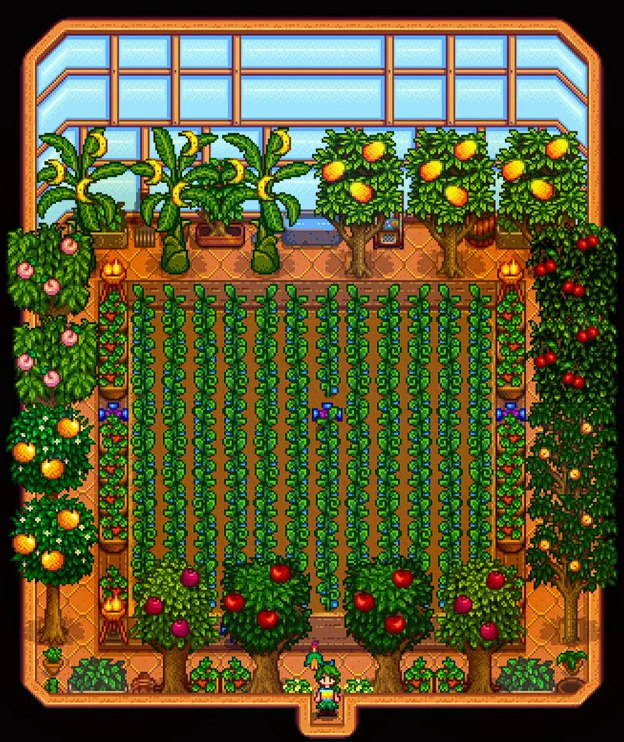 溫室建議大家在周圍種植各種類型的果樹,中間種植上古水果,灑水器有什麼用什麼,逐步更換到帶加壓噴頭的銥制灑水器,基本畢業後的佈局可參考下圖。