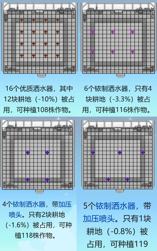 進階版:5個銥灑水器+5個加壓噴頭佈局(僅佔1耕地) 。