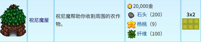 祝尼魔小屋佔地3×2,需要兩萬金幣,200個石頭,9個楊濤,10個纖維