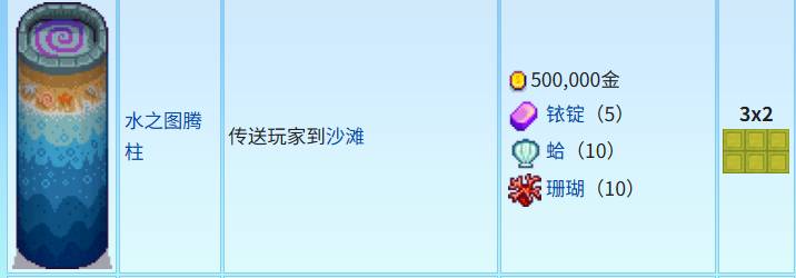 水之圖騰佔地3×2,需要五十萬金幣,5個銥錠,10個蛤,10個珊瑚,能將玩家傳送到沙灘