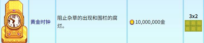 黃金時鐘佔地3×2,需要一千萬金幣,是星露穀物語中最貴的建築,還是達成完美的必要條件之一,我們能手動控制起開關