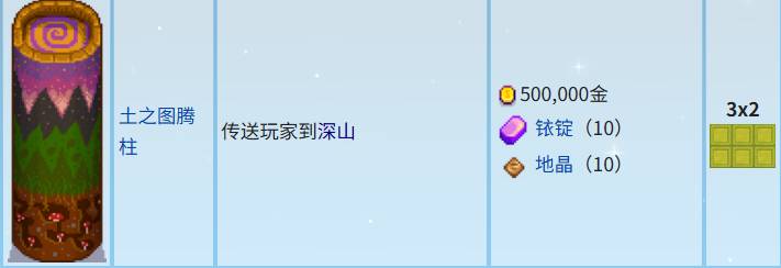 土之圖騰佔地3×2,需要五十萬金幣,10個銥錠,10個地晶,能將玩家傳送到深山