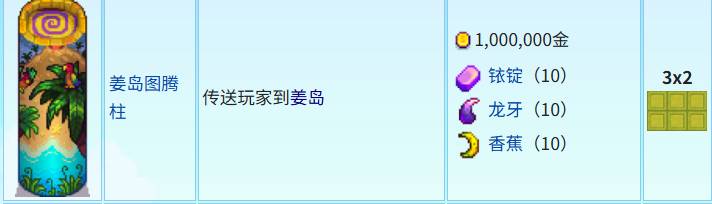 姜島圖騰佔地3×2,需要一百萬金幣,10個銥錠,10個龍牙,10個香蕉,能夠將玩家傳送到姜島