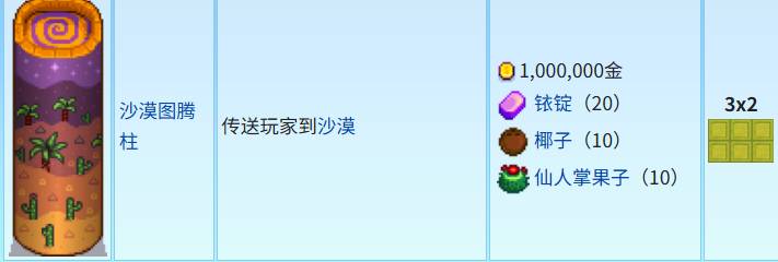 沙漠圖騰佔地3×2,需要一百萬金幣,20個銥錠,10個椰子,10個仙人掌果子,能將玩家傳送到沙漠
