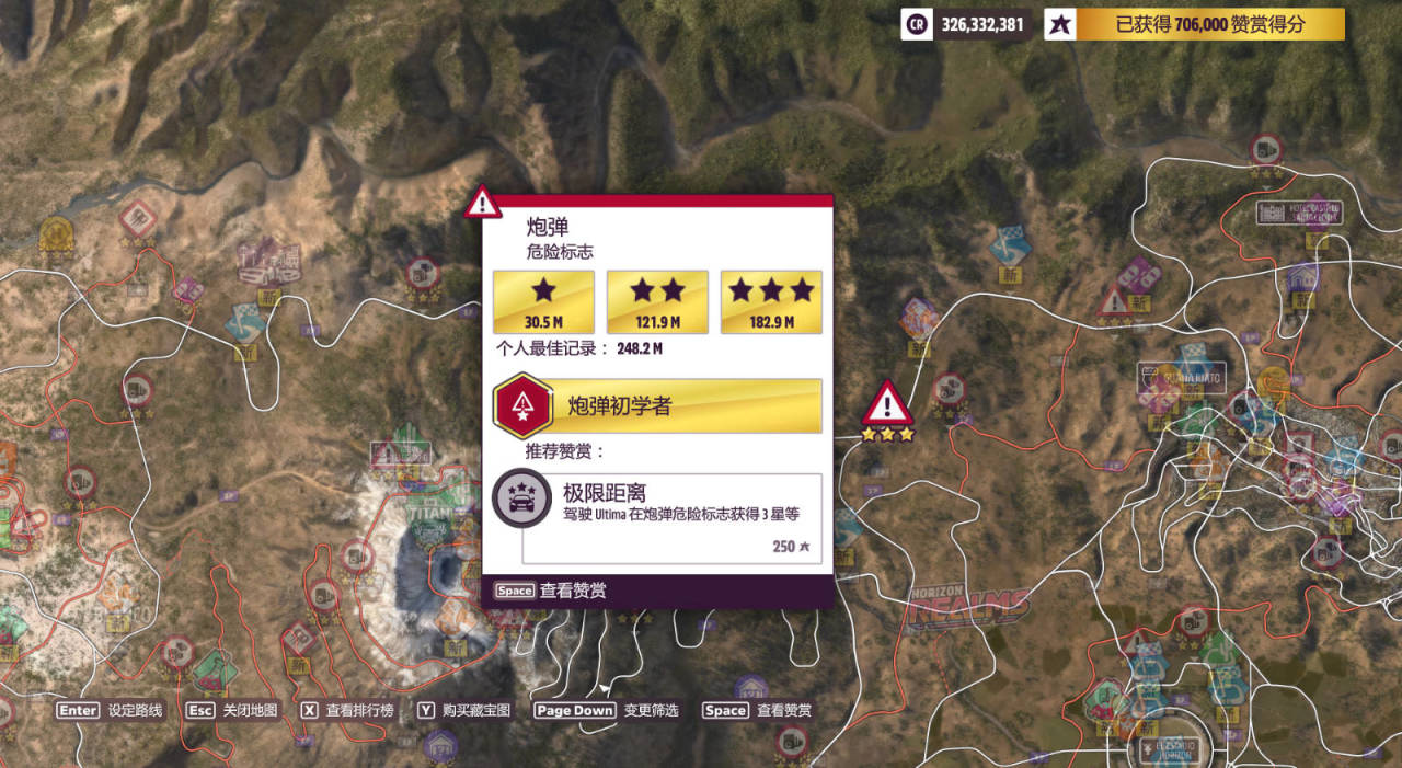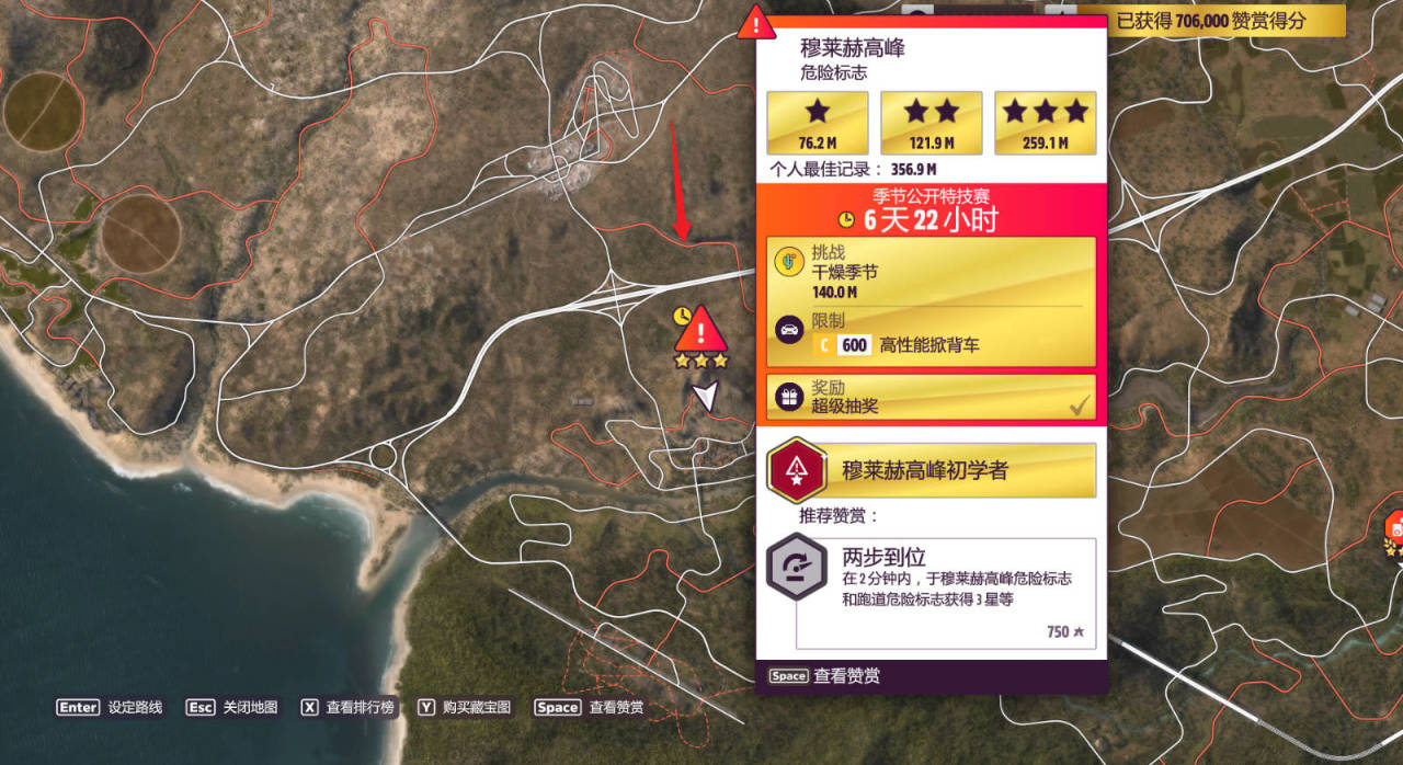 危險標誌(限制C(600)-高性能掀背車):穆萊赫高峯,完成獎勵爲超級抽獎(建議從箭頭所指處出發)