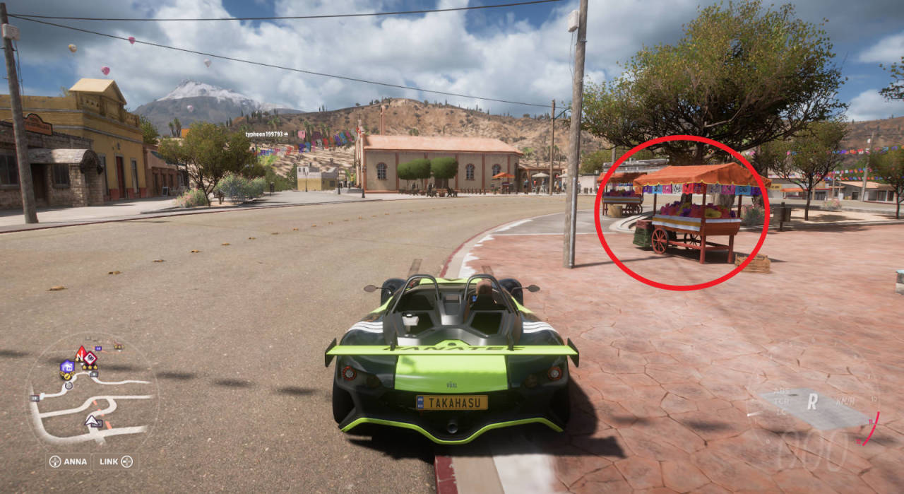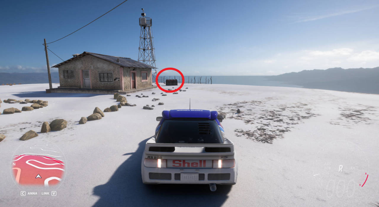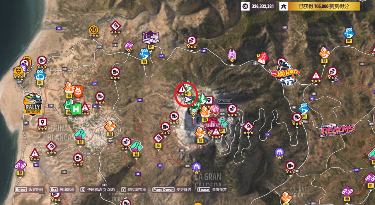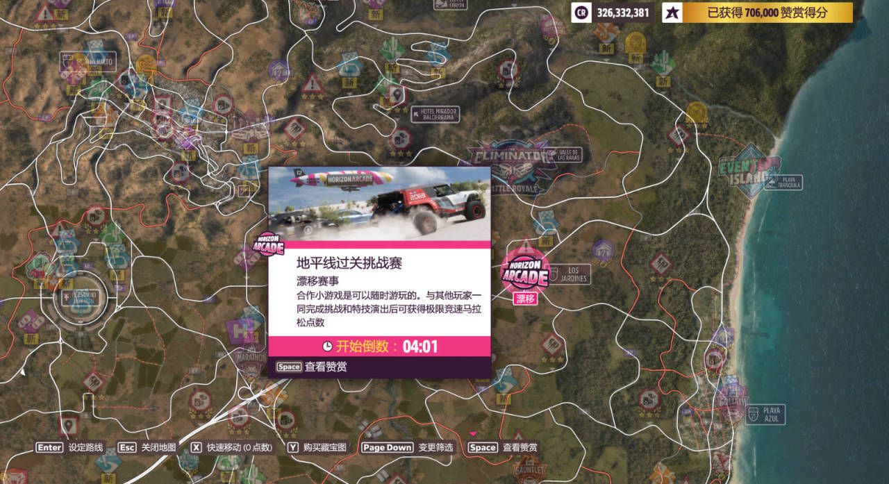 駕駛任意漂移賽車完成一場以漂移爲主題的地平線過關挑戰賽(地圖上紅色圓圈處,每15分鐘刷新一次,記得要選擇漂移車)