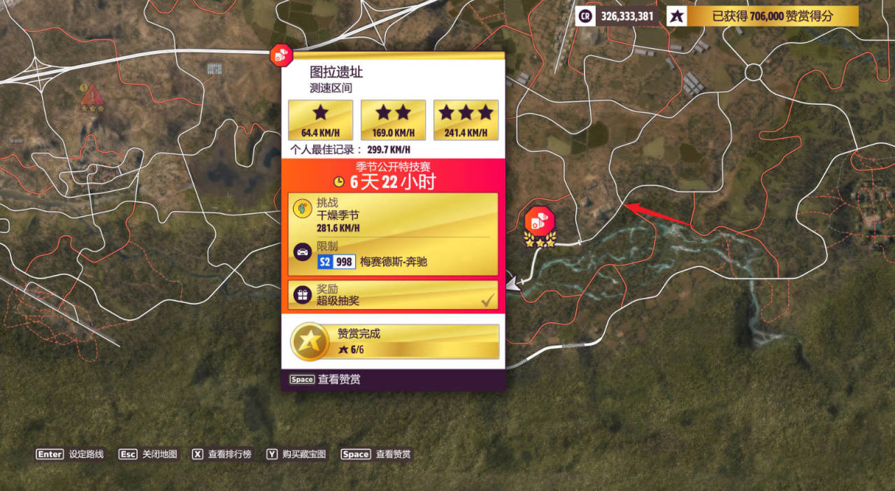測速區間(限制S2(998)-梅賽德斯-奔馳):圖拉遺址,完成獎勵爲超級抽獎。(建議從箭頭所指處出發,儘量拉遠點)