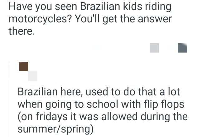 我是巴西人,以前經常這樣穿人字拖騎摩托上學,夏天和春天的週五是允許的。