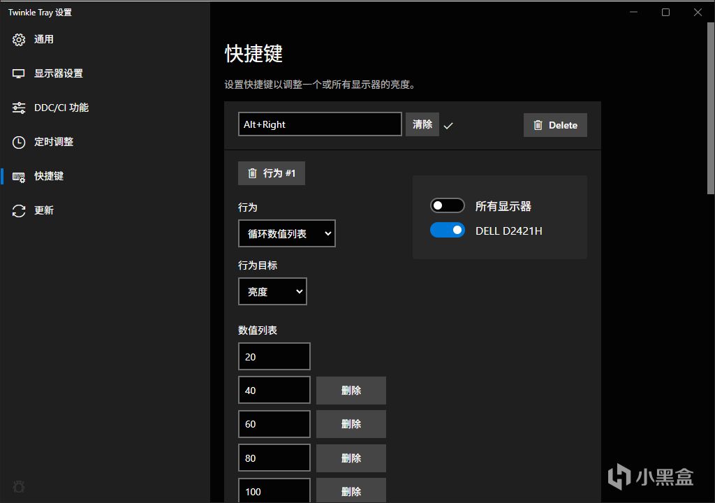 一種比較老的顯示器,不支持亮度快捷鍵增加減少,但是可以設置爲數值循環,從20到100,一個快捷鍵循環調節也夠用了。