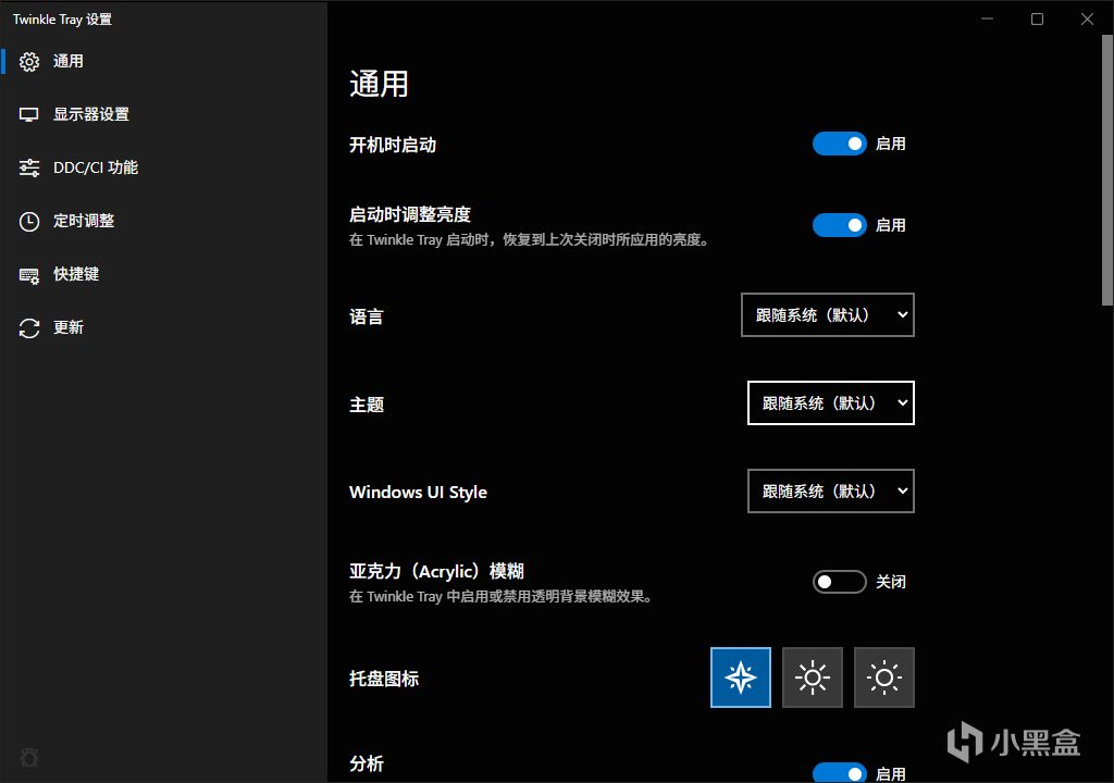 下載後點擊托盤圖標就可以快速調整亮度了,這就和筆記本內置屏幕使用右下角windows的自帶亮度調節一樣了,不過僅僅這樣肯定是不夠的,我們還需要再搞一個快捷鍵調節,這樣全屏遊戲的時候纔好用。