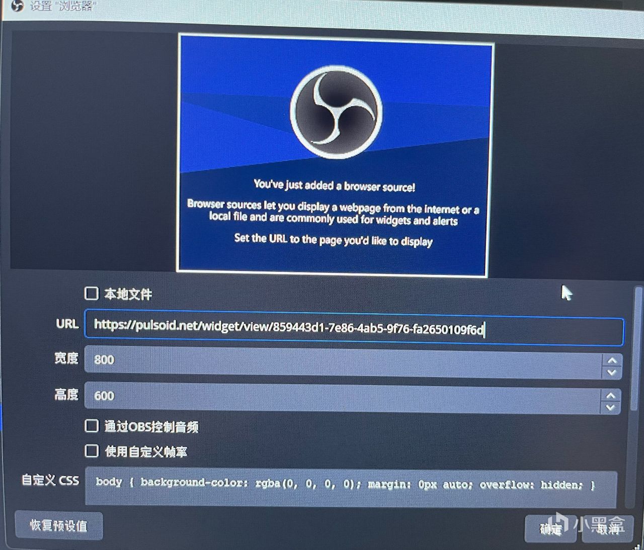 打開直播軟件OBS,在源處添加瀏覽器採集,url處粘貼剛剛複製的鏈接,