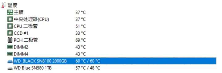 最後我們看了看跑寫入測試時,WD_BLACK SN8100溫度也很低,一直在60-70°C之間徘徊: