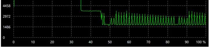 又持續寫入一段時間後,速度進一步掉到1500MB/s。但從曲線可以發現:速度又會回彈到3000MB/s,並循環往復: