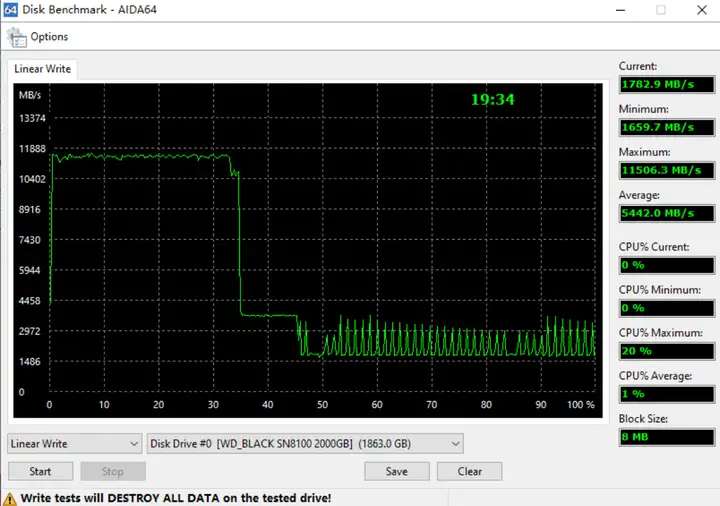 可以看到,寫入約30%也就是600G後,獨立緩存用完,硬盤速度掉到了3000MB/s