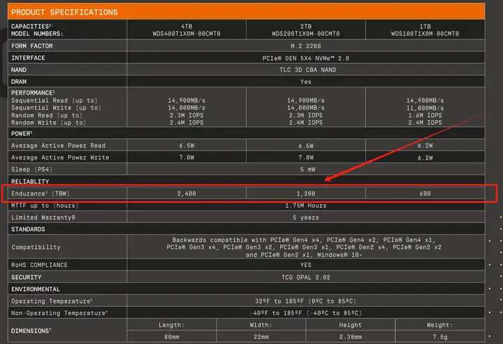 從官網可看到,WD_BLACK SN8100 2T版本有着誇張的1200TBW: