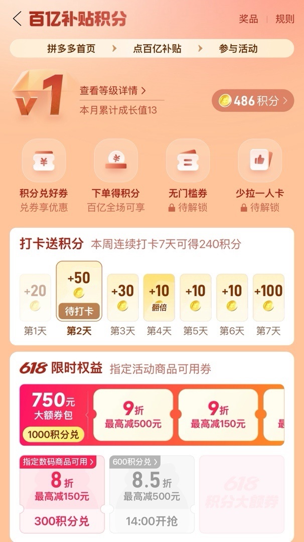 友情提示:如果有刷不出我這裏截圖價格的玩家,建議最近多刷刷百億補貼欄目,多搜索一下自己最近想要買的PS5遊戲,實在不行換個新號試試,某多黑號是刷不到便宜價格的實體版遊戲,建議先養一下號。判斷是否黑號的方法很簡單,看看自己進百億補貼專頁裏,右上角有無積分,能否點進去兌換券,如果沒有積分肯定就是黑號了。此外V1用戶也可以攢1000積分(之前需要800積分V3會員)領4000-400的券或者750元大額券包(9折最高減500元),最近想買NS2或者PS5Pro主機的朋友,可以每週連續打卡領240積分攢着兌換一下,能便宜一點是一點,值得注意的是次月底會清空積分,能用就儘量先用,免得過期了。
