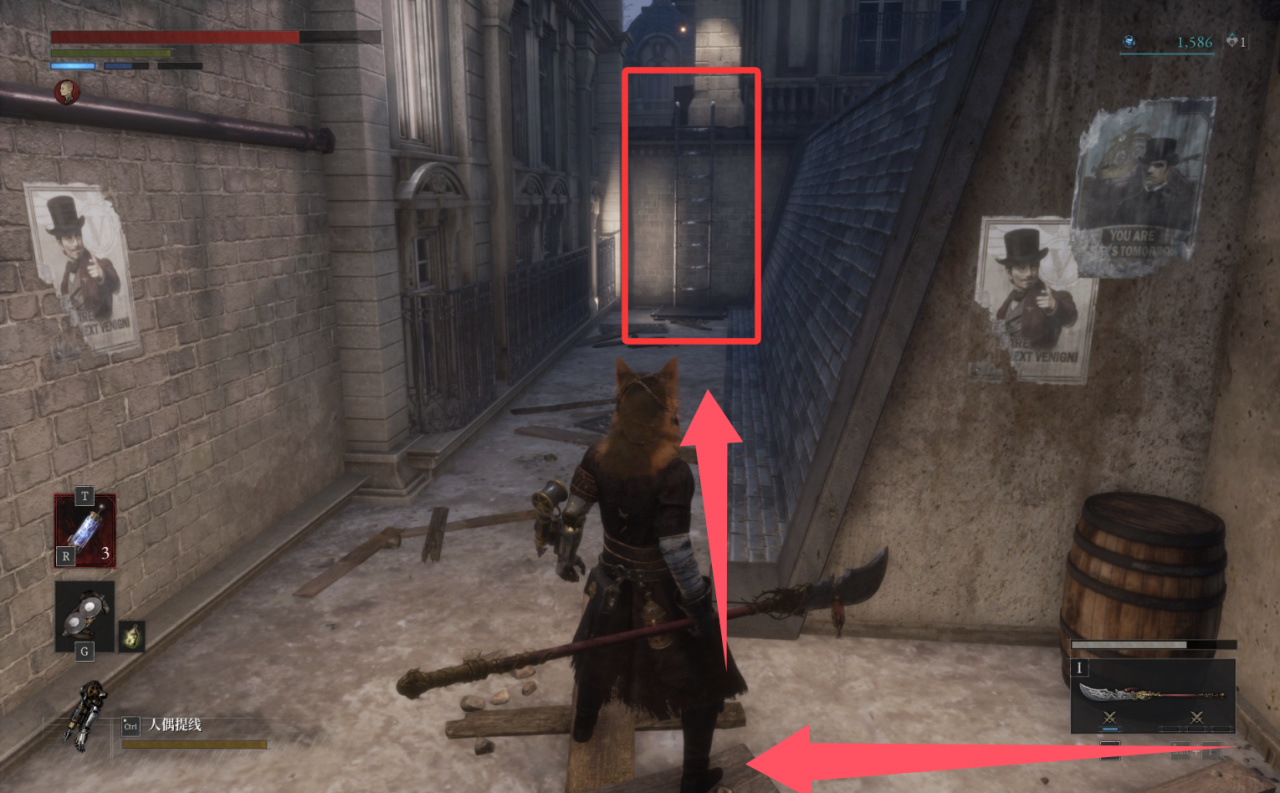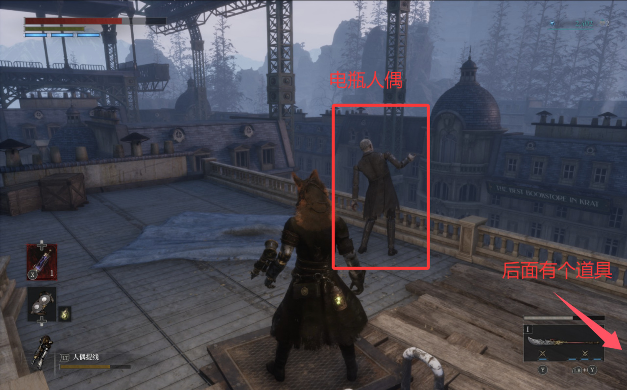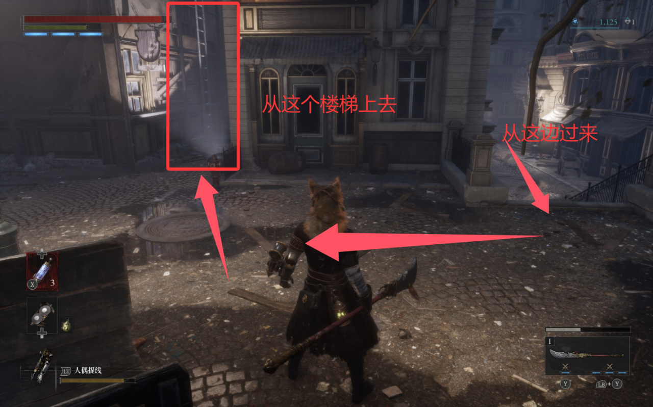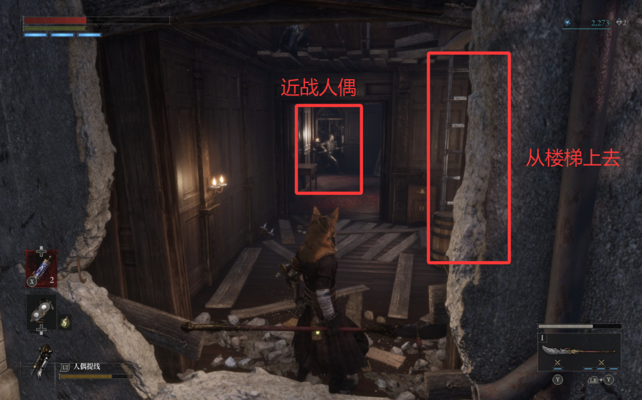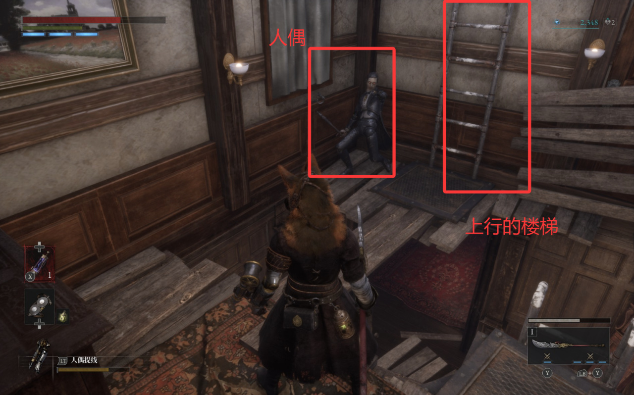 上樓之後記得轉頭,會在對面的平臺上面看到一個人偶緩慢地起身,建議直接過去攻擊然後擊敗,接着從箭頭所指的樓梯上去即可