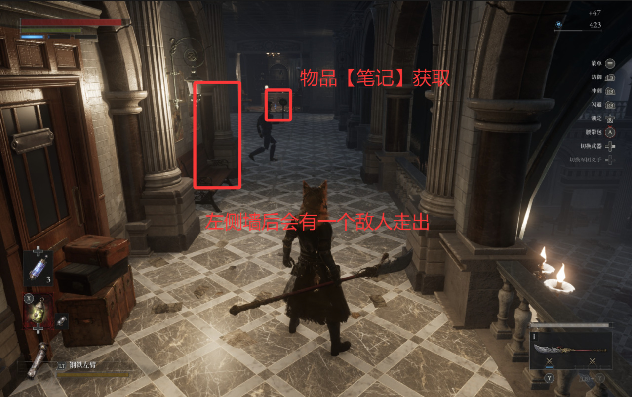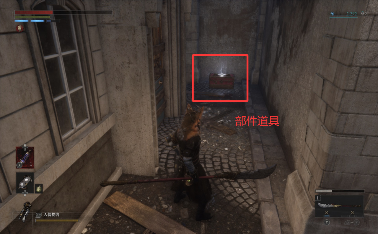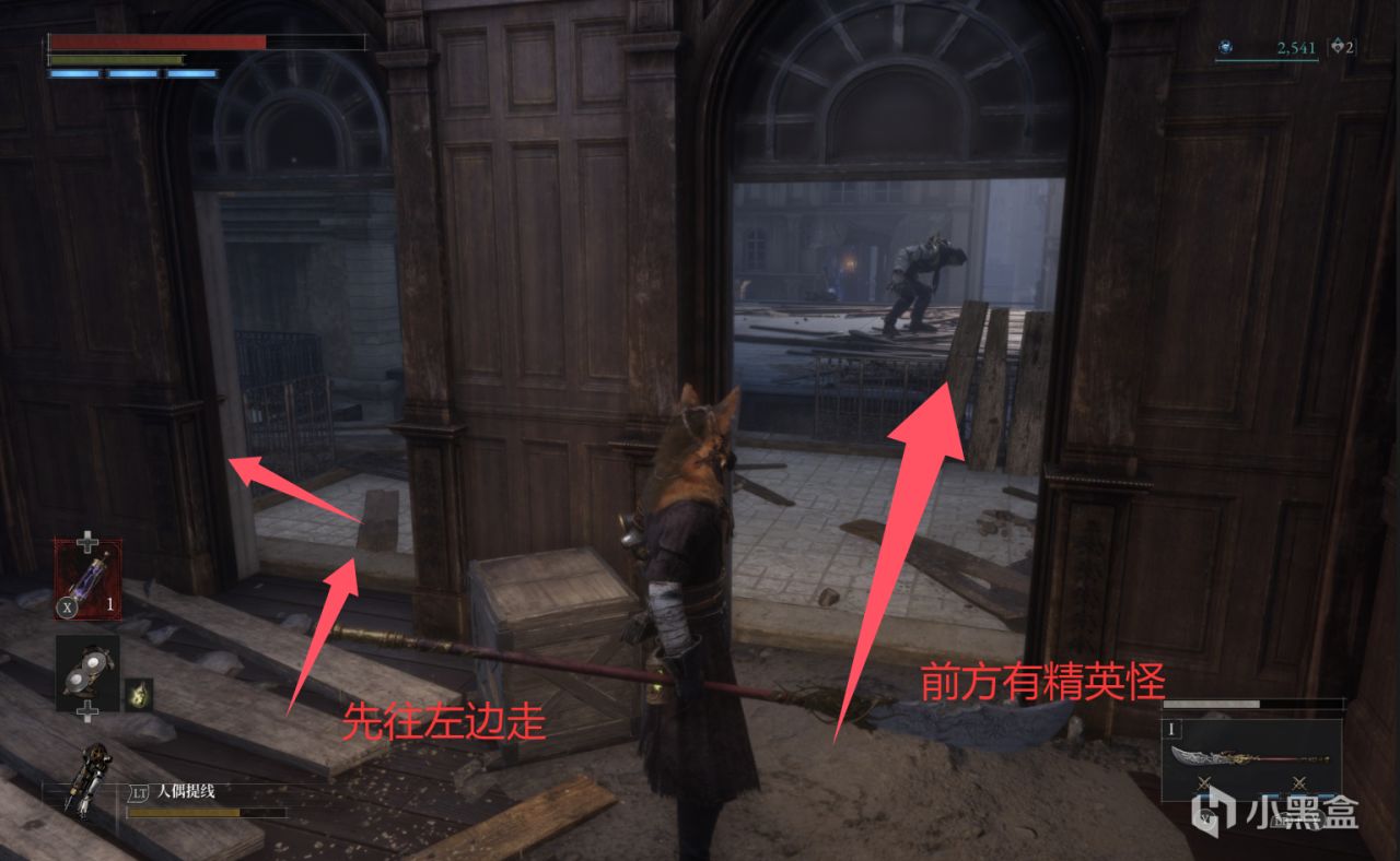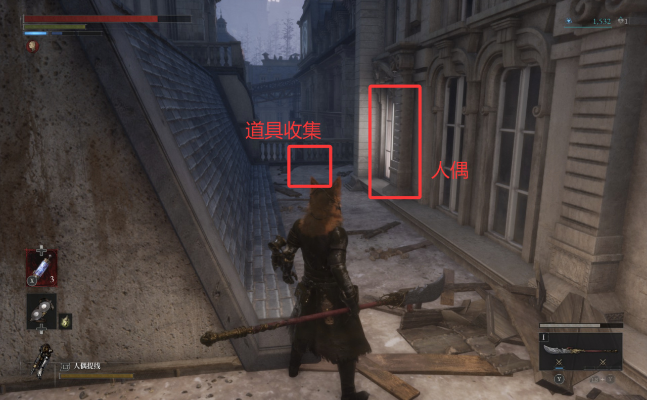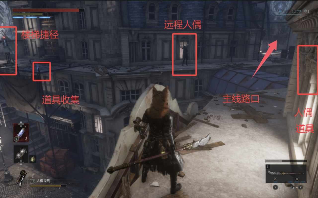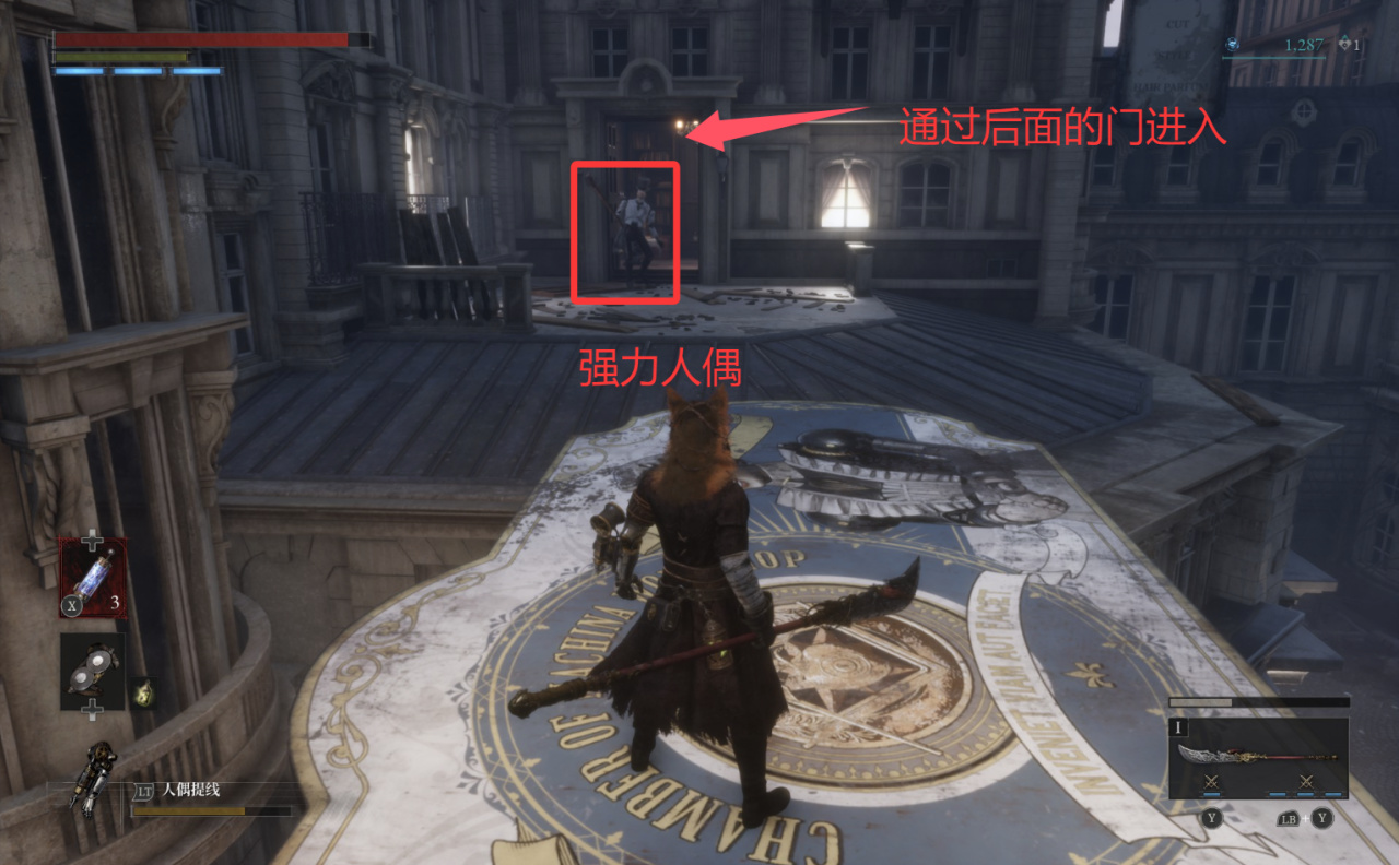 進門之後連續路過兩個門欄,即可來到如圖所示位置。個人推薦先將二樓遠程敵人擊敗之後再處理一樓近戰人偶,二者擊敗之後從右側小門進入有道具收集