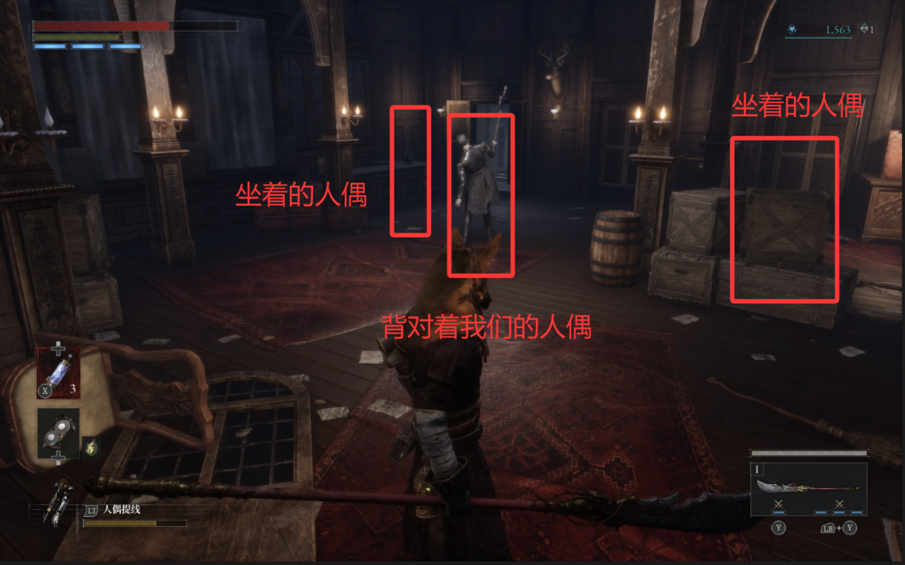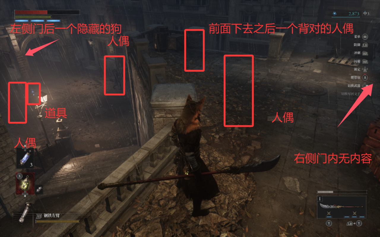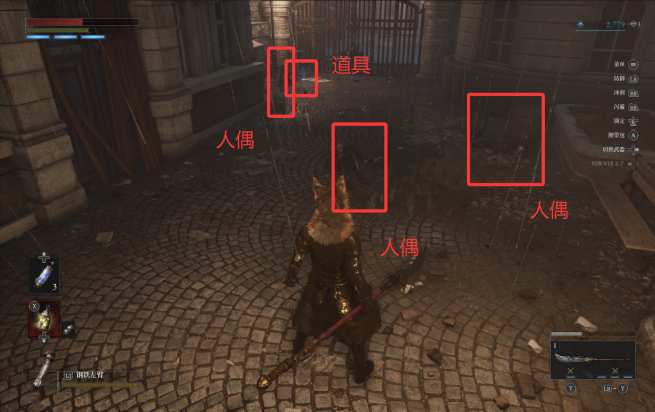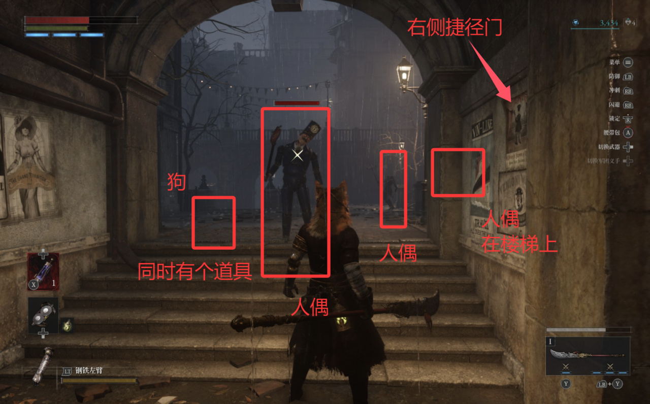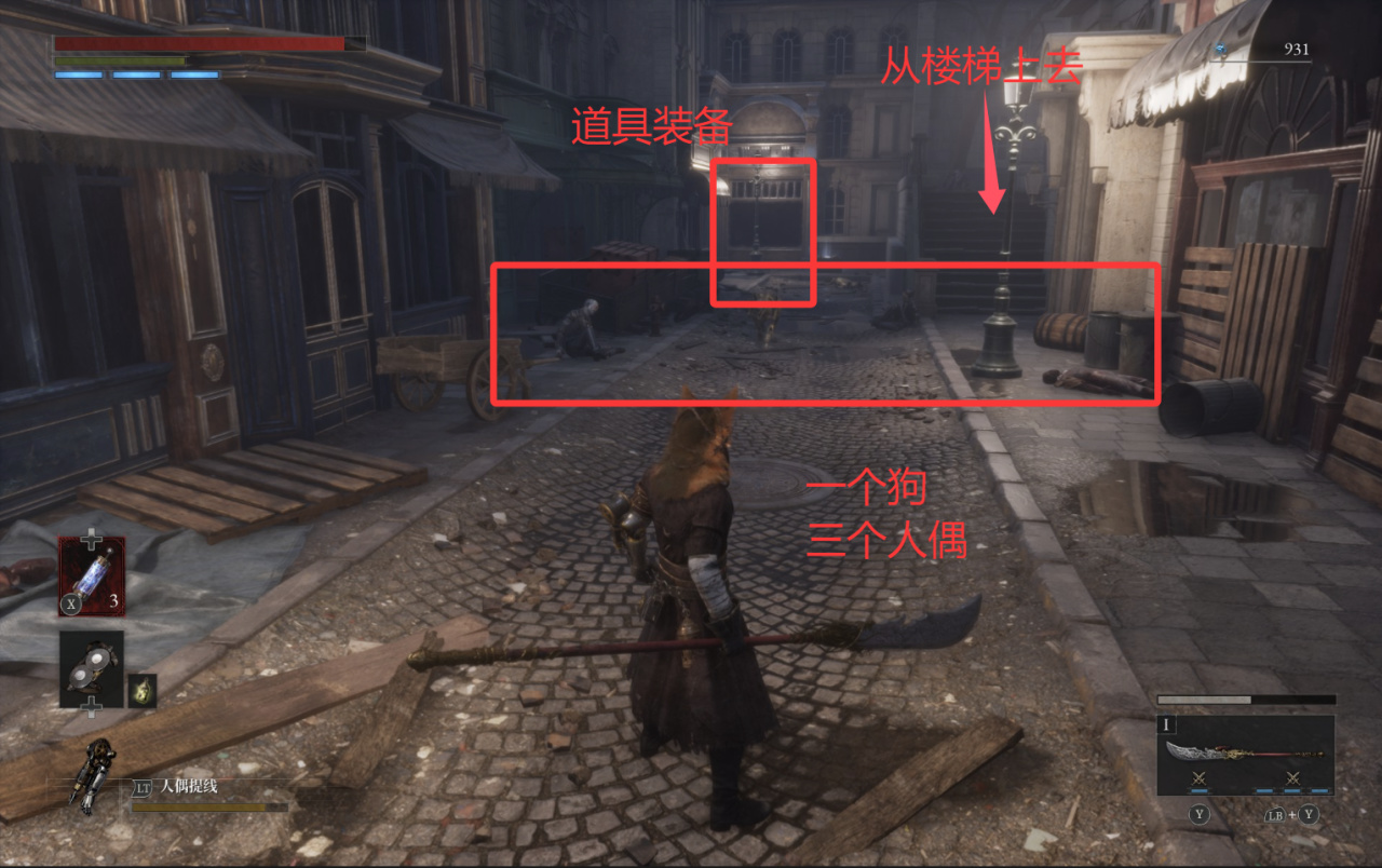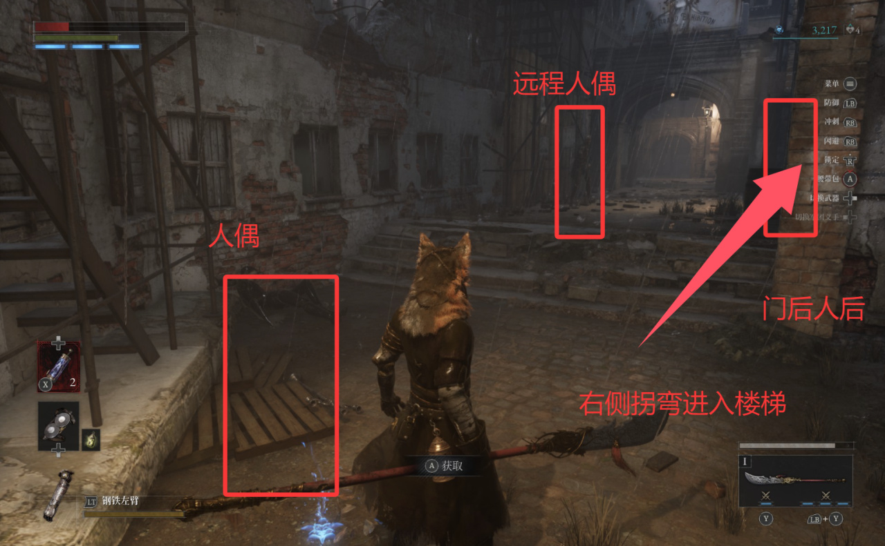 進門之後連續路過兩個門欄,即可來到如圖所示位置。個人推薦先將二樓遠程敵人擊敗之後再處理一樓近戰人偶,二者擊敗之後從右側小門進入有道具收集