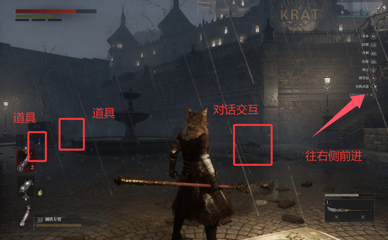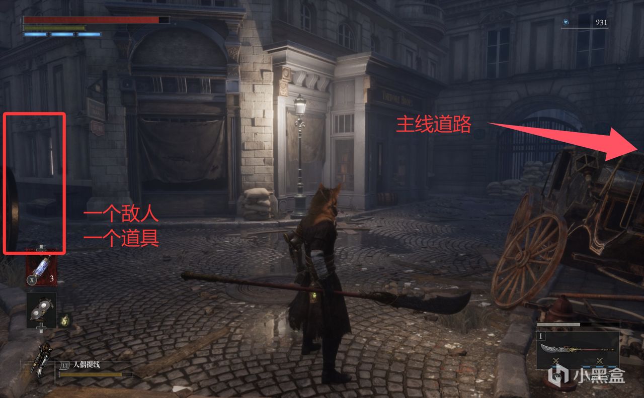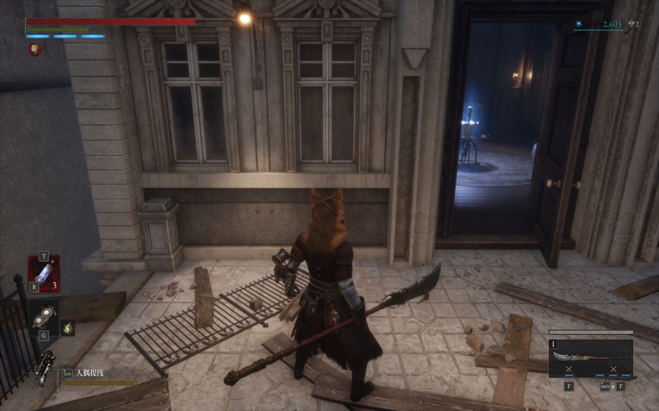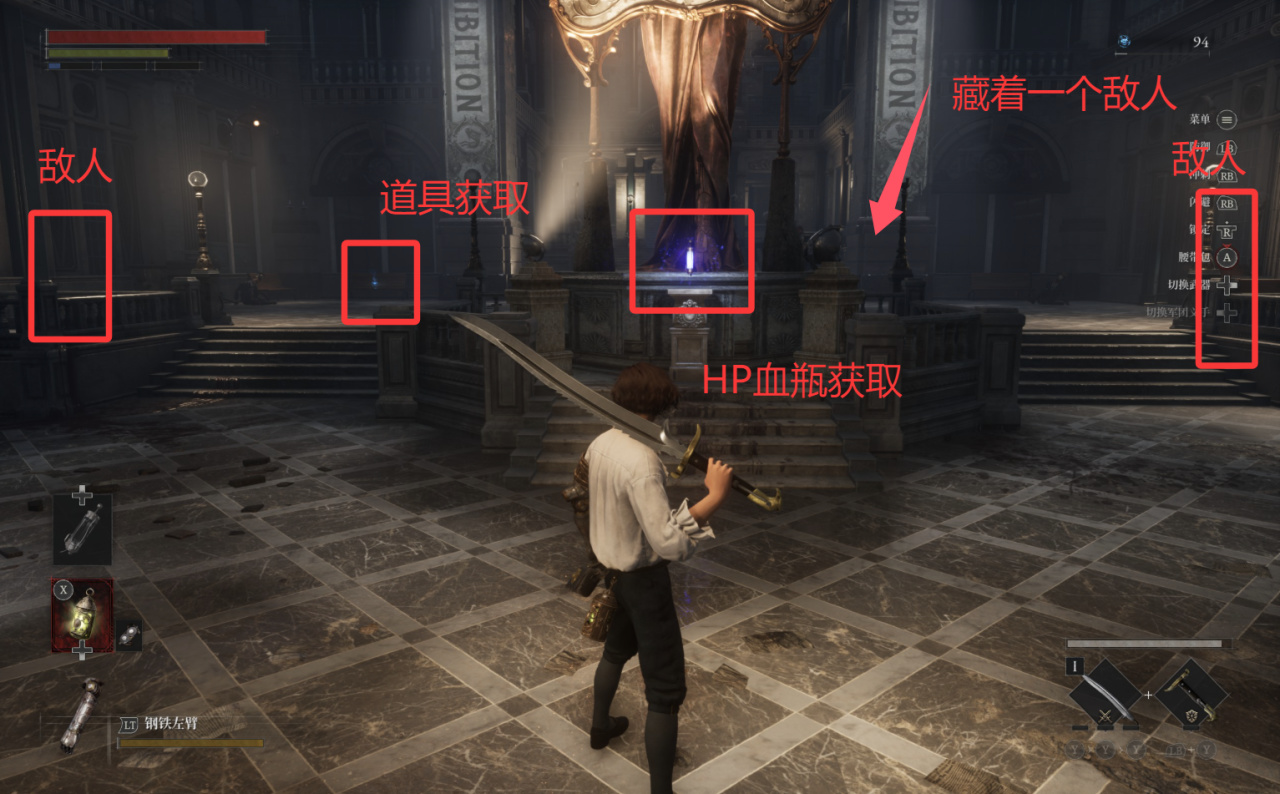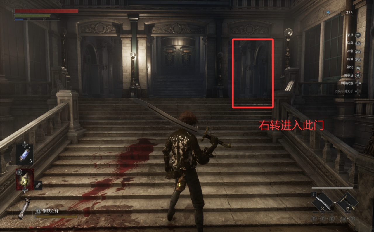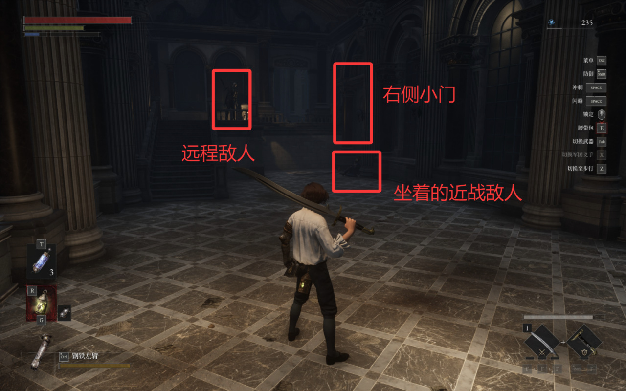 進門之後連續路過兩個門欄,即可來到如圖所示位置。個人推薦先將二樓遠程敵人擊敗之後再處理一樓近戰人偶,二者擊敗之後從右側小門進入有道具收集