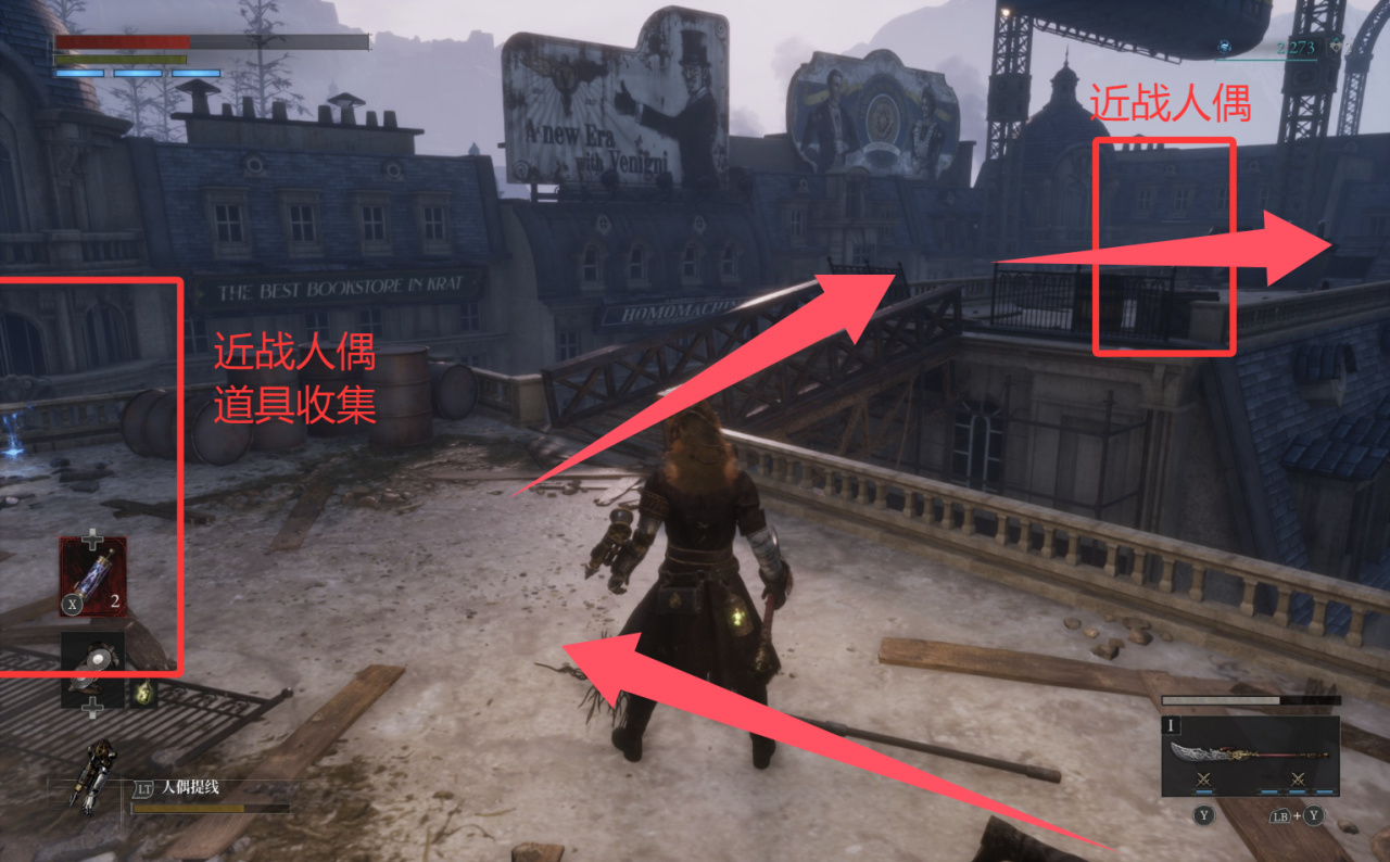 擊敗牆後的人偶以後,此時建議快速打右邊的敵人之後用人偶勾線構築遠程人偶,記住最右側還有一個道具可以獲取