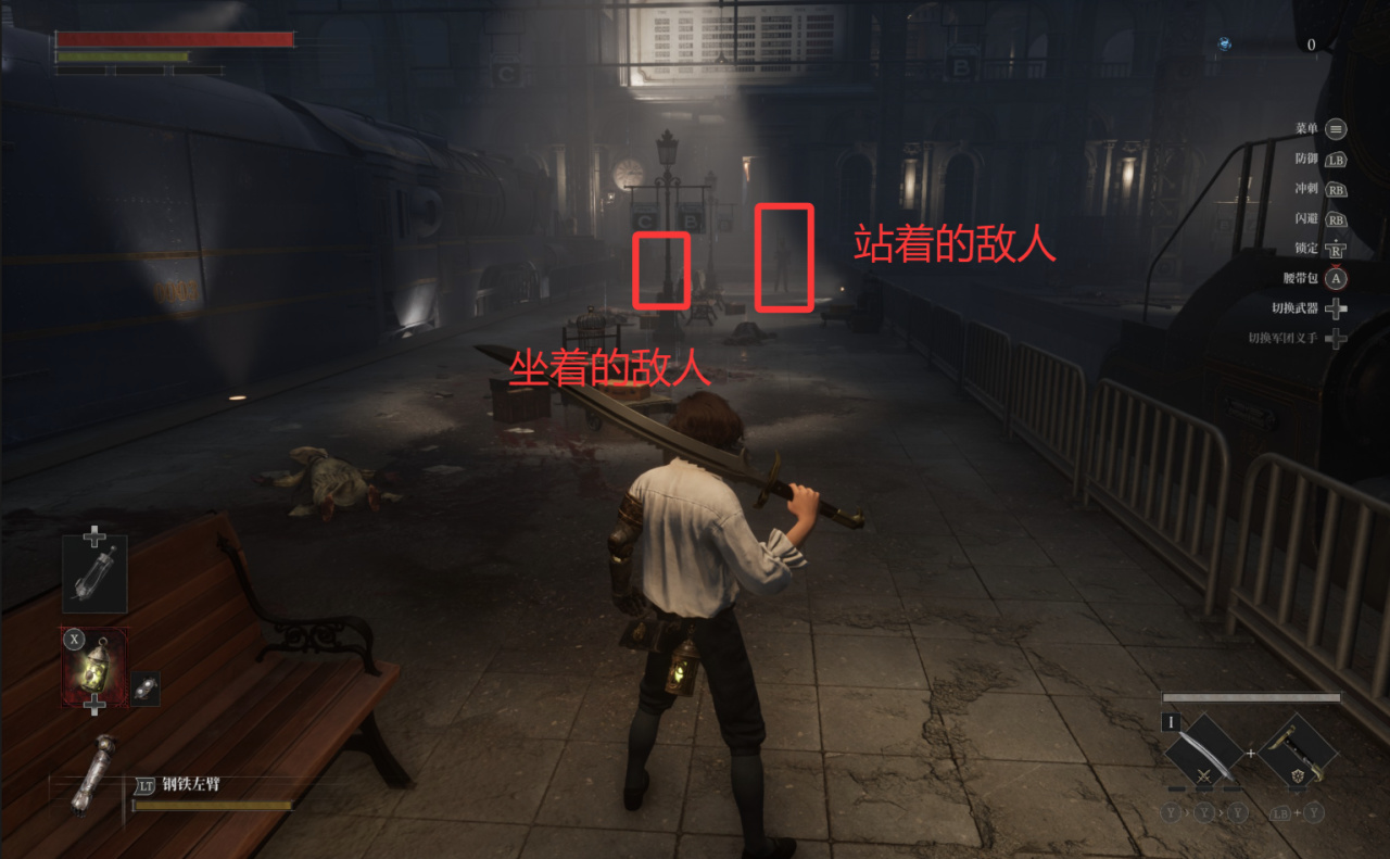 離開車廂以後,將視角左轉即可看到如圖所示場景,本地圖之中敵人已在圖中標出,難度不高相當於練手熟悉攻擊方式。